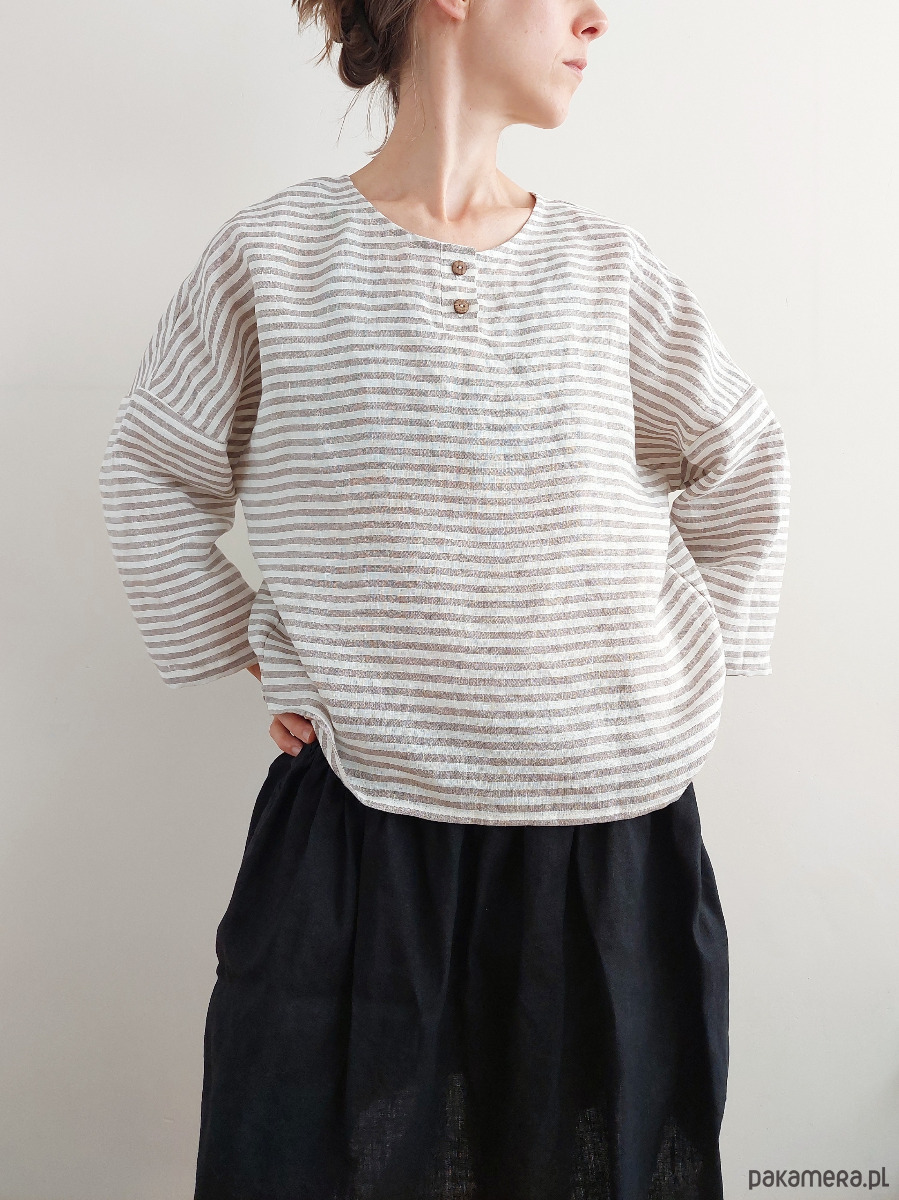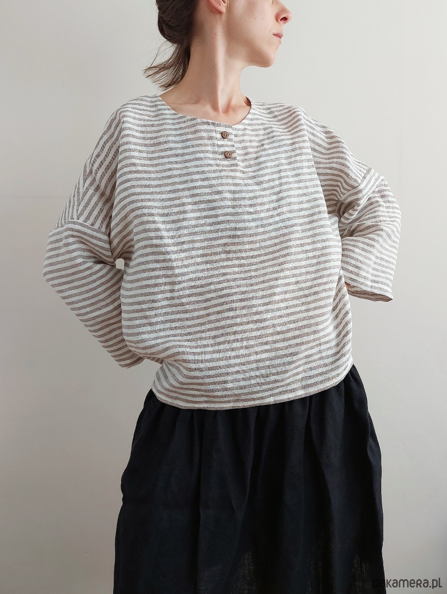 Wykonana z polskiego lnu 100%, paski w kolorze mocha, delikatna, cudownie wygodna, luźna, miła dla skóry i oka.