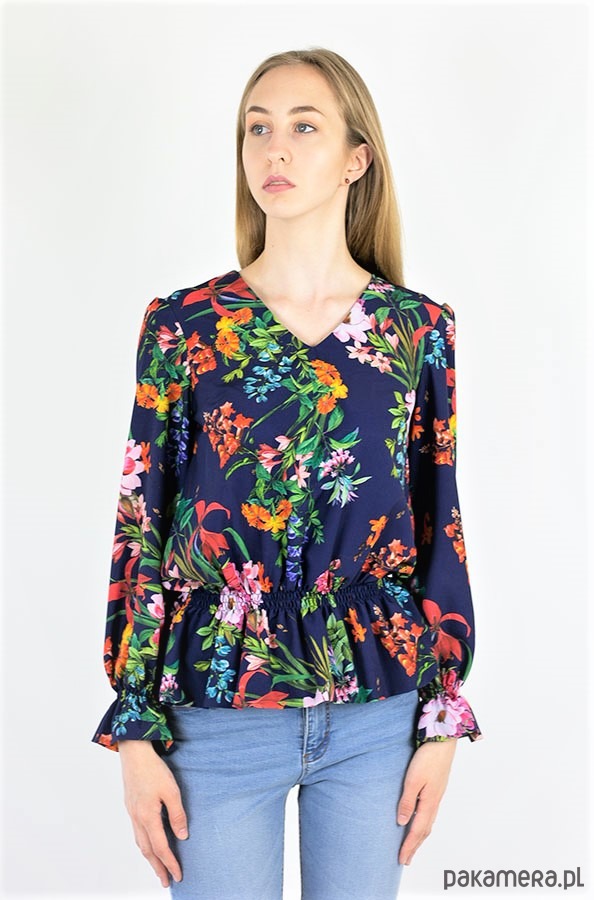 Przymarszczana w talii bluzka ze sztucznego jedwabiu. O swobodnym kroju z efektowną falbanką. Posiada długi rękaw. Ładnie podkreśla kobiecą figurę, jednocześnie jest bardzo wygodna i swobodna. Idealna do jeansów, szortów i spódnicy. Klasyczny krój i kwiatowy print idealnie sprawdzi się do niejednej stylizacji.