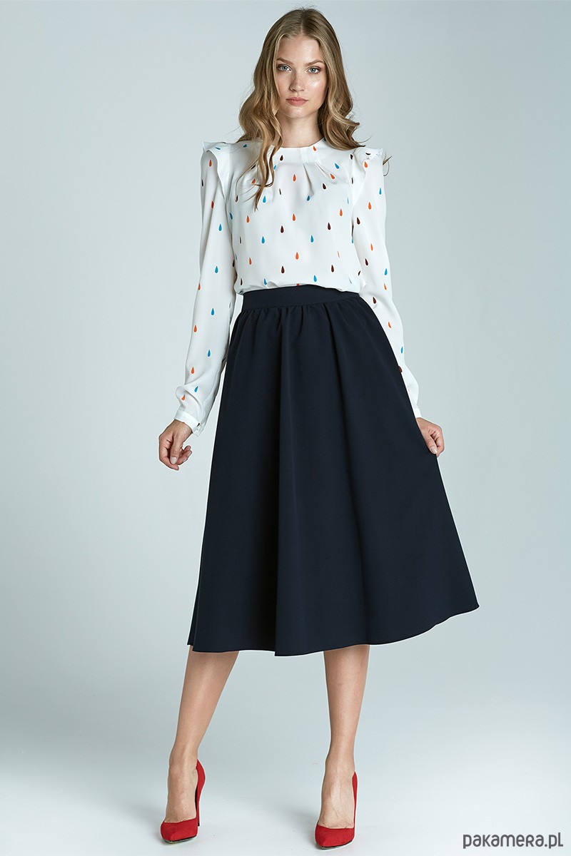 Bluzka prosta, nie taliowana, zapinana z tyłu na mały guzik na wysokości karku. Rękawy klasyczne, wykończone delikatnym mankietem.