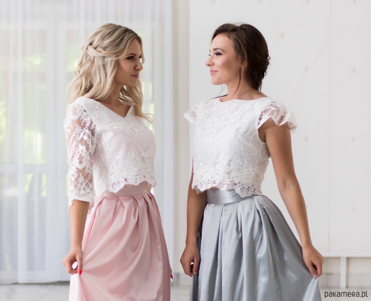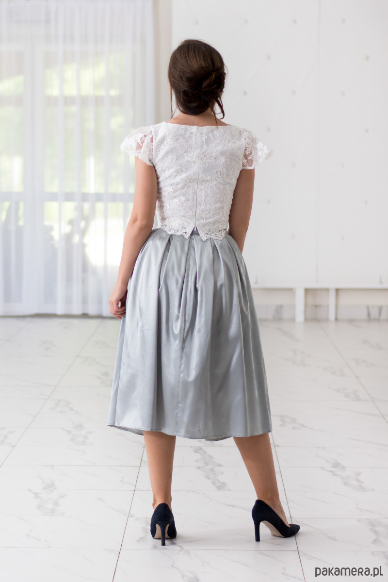 Bluzka z krótkim rękawem-falbanką. Jest wykonana z koronki na satynowej podszewce. Posiada eleganckie wykończenie na brzegach. Zasuwana z tyłu na kryty suwak, wkładana przez głowę. Pięknie prezentuje się z wszystkimi spódnicami i spodniami z wysokim stanem. Można nosić ją na eleganckie przyjęcia i wieczorne imprezy bawiąc się zestawianiem kolorów.