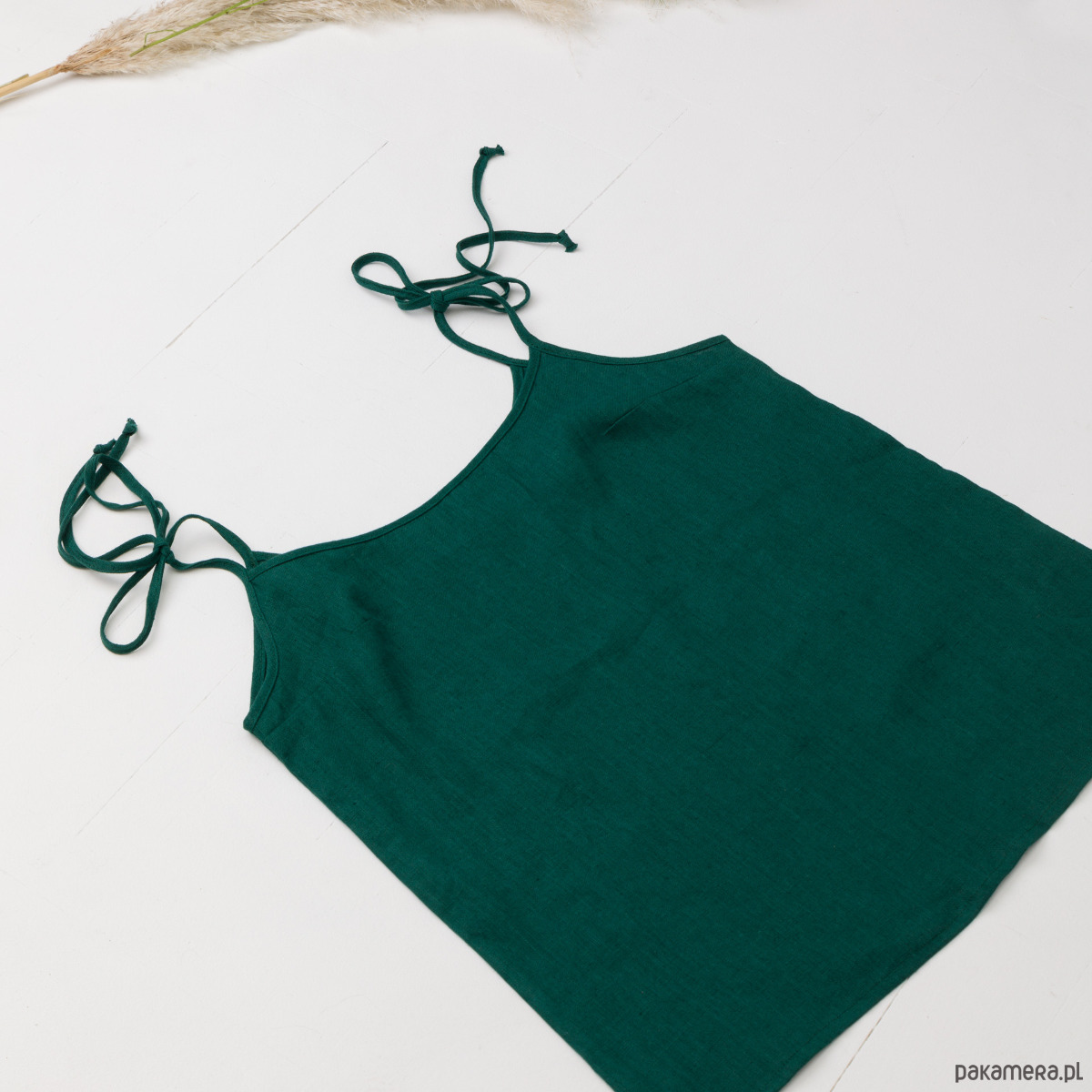 Lniana koszulka na wiązanych ramiączkach o długości ok. 50 cm – mozliwość regulacji długości bluzki. Komfortowa i wygodna na każdą porę roku. Modelka ma na sobie rozmiar S.