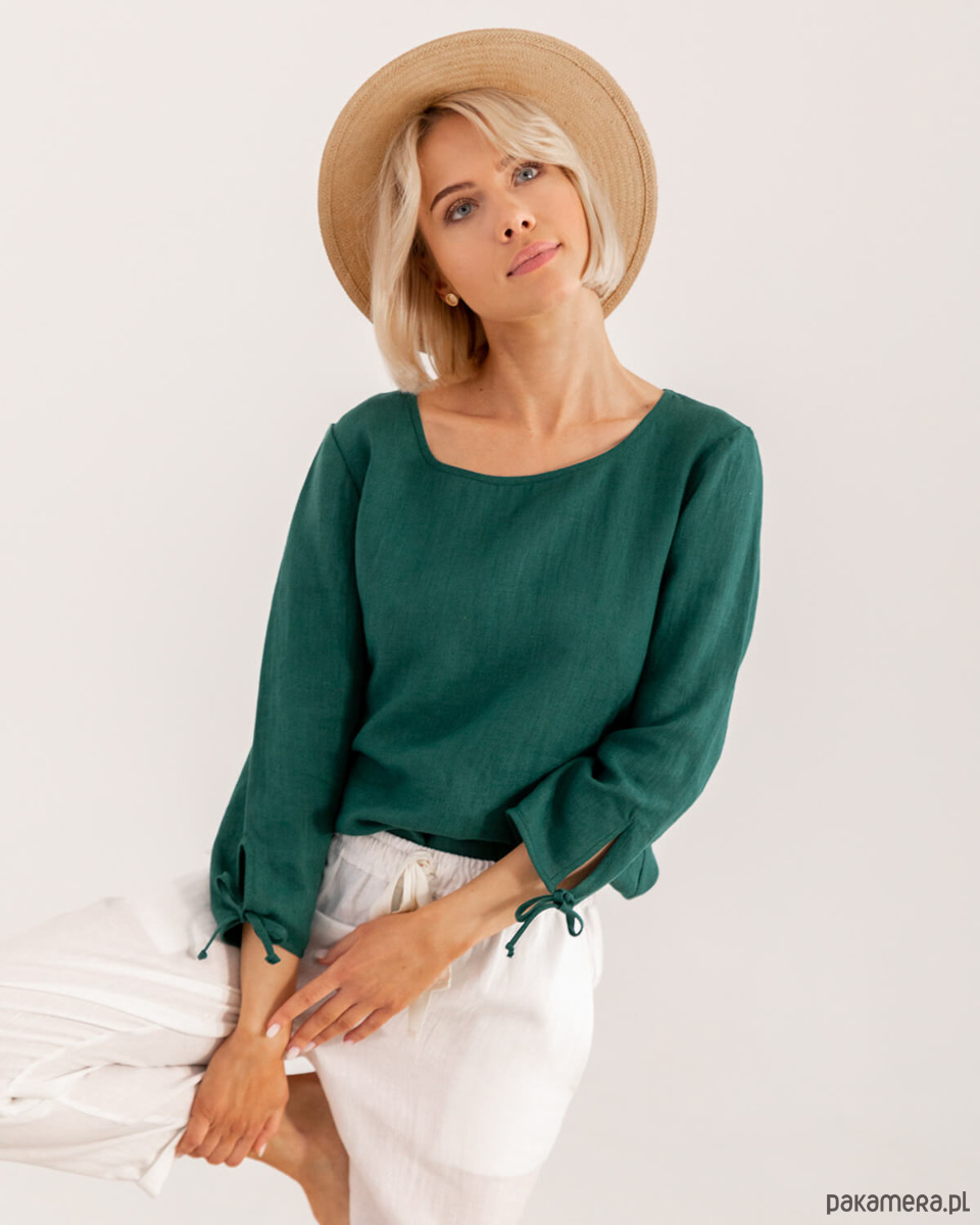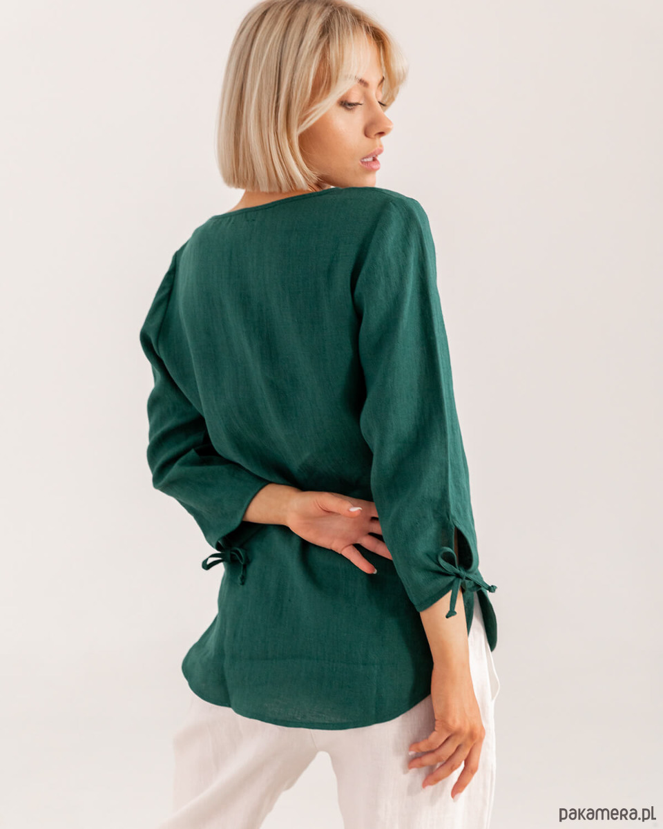 Lniana bluzka o klasycznym kroju. Komfortowa i wygodna na każdą porę roku. Modelka ma na sobie rozmiar S.