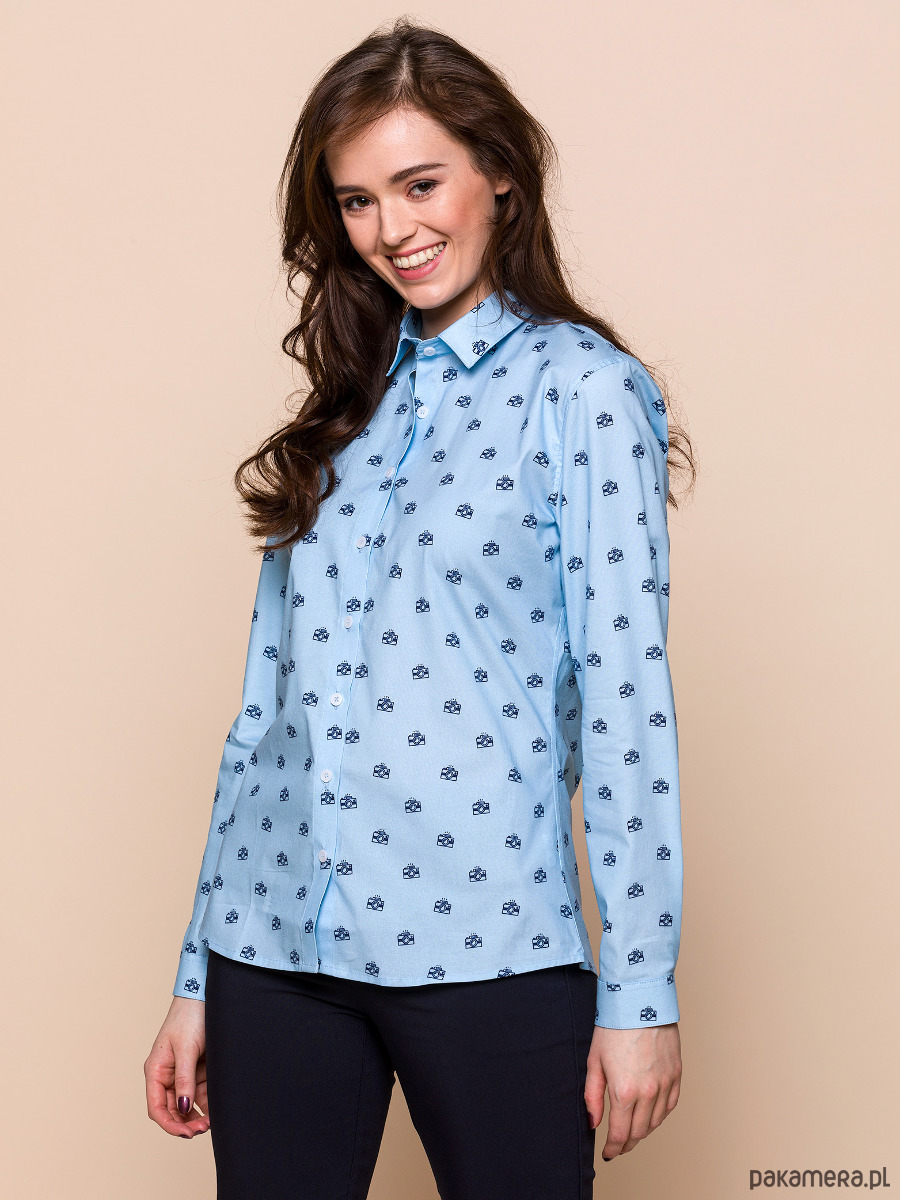 Niezła z Ciebie aparatka?! Błękitna koszula w granatowy wzór aparatów fotograficznych sprawi, że zabłyśnij jak najjaśniejszy z fleszy. To koszula, która gwarantuje utrwalenie Twojego wizerunku w niejednej głowie. Idealna w (i na) plener, na miasto, do pracy i wszędzie tam, gdzie chcesz zabłysnąć niczym najjaśniejszy z fleszy. Świetna propozycja do selfie, zdjęć legitymacyjnych i grupowych. Obywatelko, uśmiechnij się i powiedz „Cheeese”.