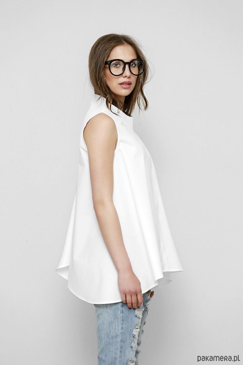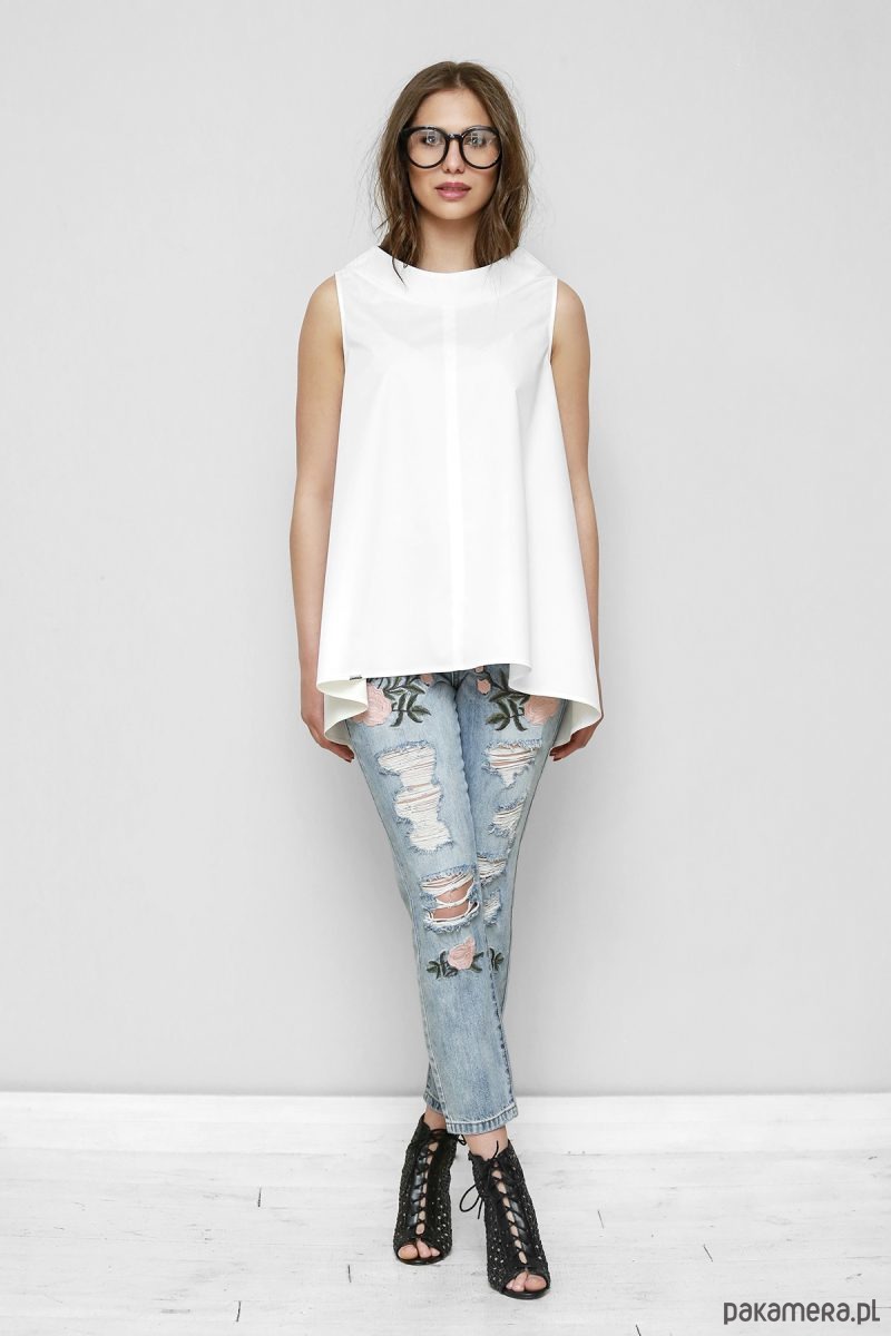 Fason trapezowy - poszerzany ku dołowi. Górę bluzki zdobi szeroki karczek. Wkładana przez głowę.
