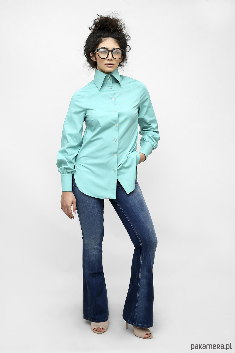 Klasyczny krój koszuli został przełamany dużym, wysokim kołnierzem i guzikami z masy perłowej, które nadają niepowtarzalnego charakteru całości. Model z szerokimi mankietami i wycięciem po bokach subtelnie podkreśla figurę nie opinając jej.
