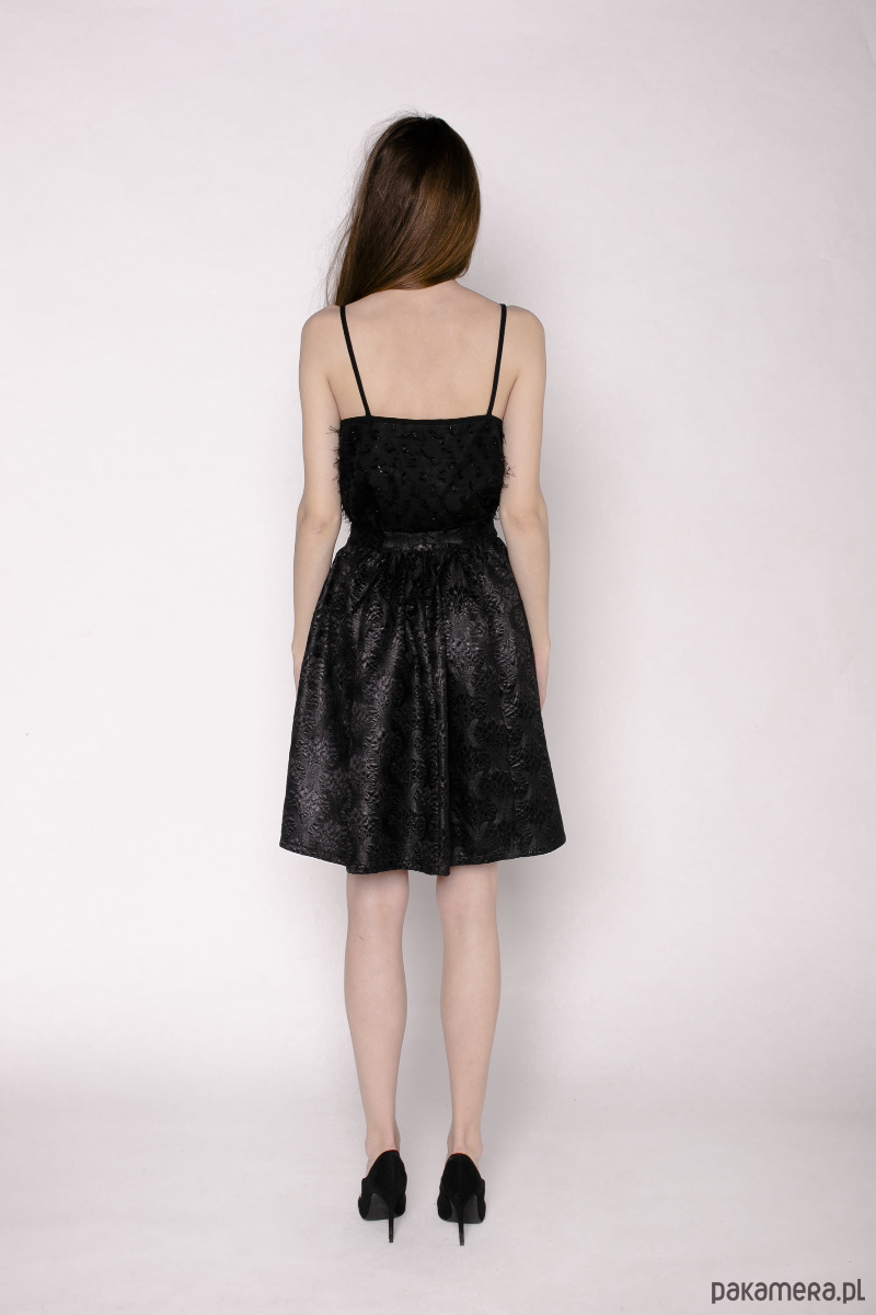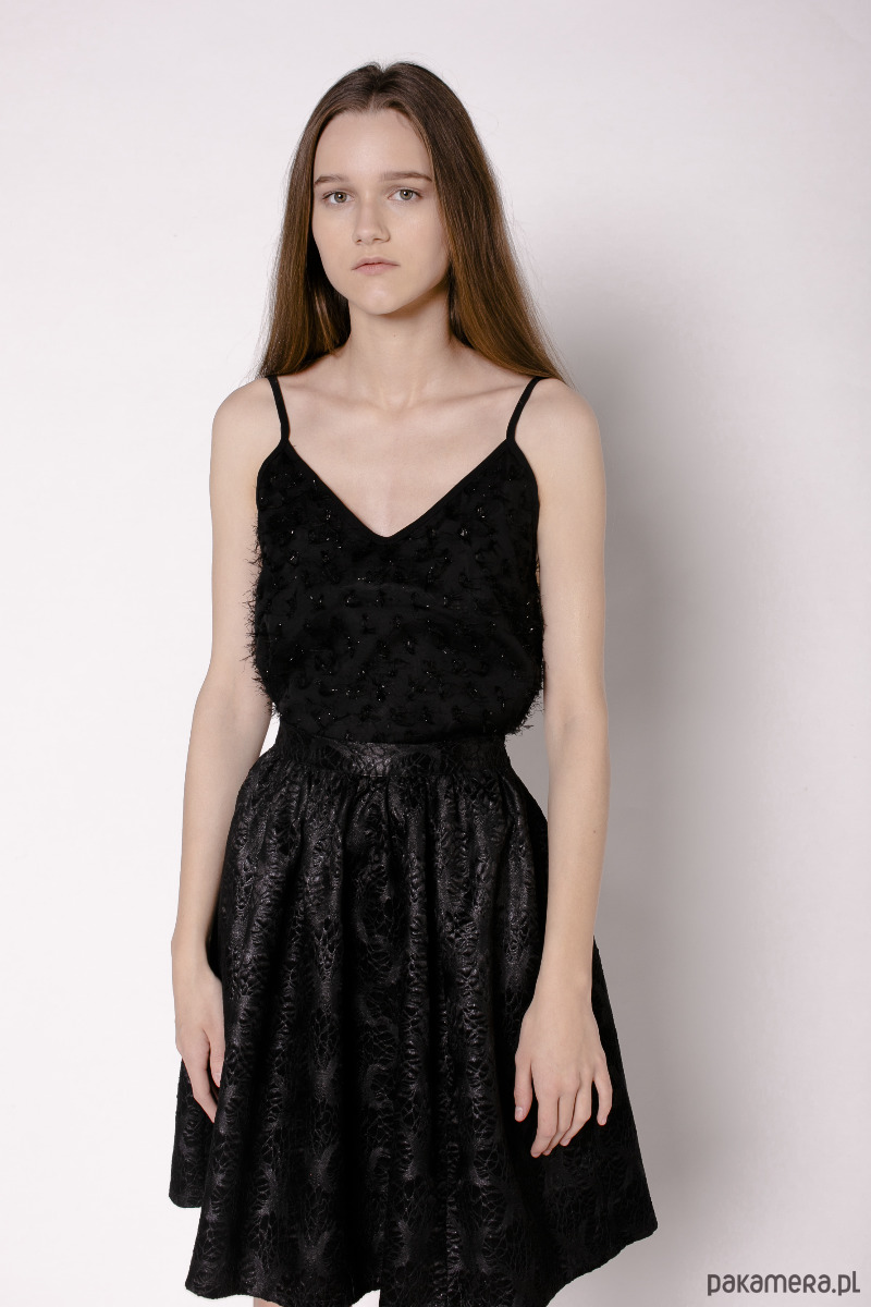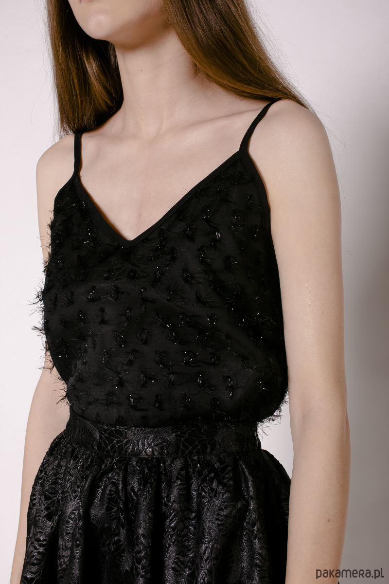 Wyjątkowa letnia bluzka na cienkich ramiączkach, wykonana z delikatnego czarnego szyfonu z aplikacjami. Bluzka na podszewce, posiada zaszewki na przodzie, dekolt w literę V. Modelka na zdjęciu ma wzrost 175 cm.
