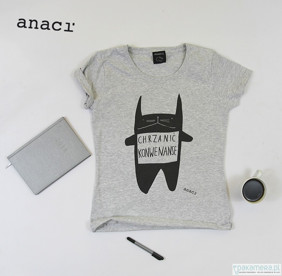 Dla tych co żyją jak chcą, bez niepotrzebnych, krępujących i sztywnych zasadonorm ! ;) dla tych, co mają poczucie humoru i dystans do siebie, świata i ludzi. Szara, damska koszulka bawełniana ( 97 % bawełny, 3 % poliestru ). Prać ręcznie, a jeśli w pralce to w 30 stopniach. S 44,0 cm 63,0 cm M 46,5 cm 64,0 cm