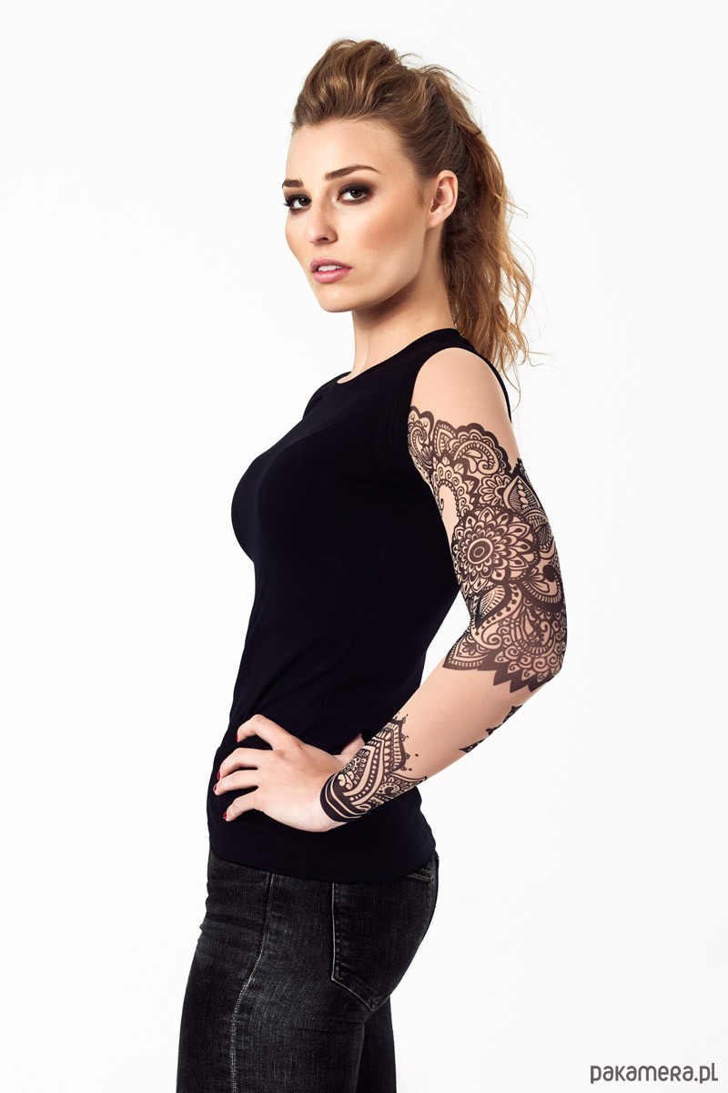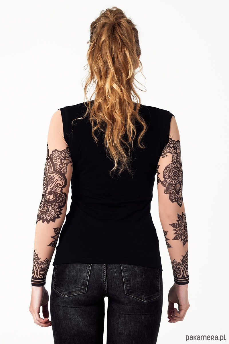 Koszulka tank top z klasycznym, okrągłym dekoltem o ładnie dopasowanym kroju oraz wszytymi rękawami dającymi złudzenie prawdziwych tatuaży. Na obu rękawach - orientalny i bardzo oryginalny wzór z motywem mandala.