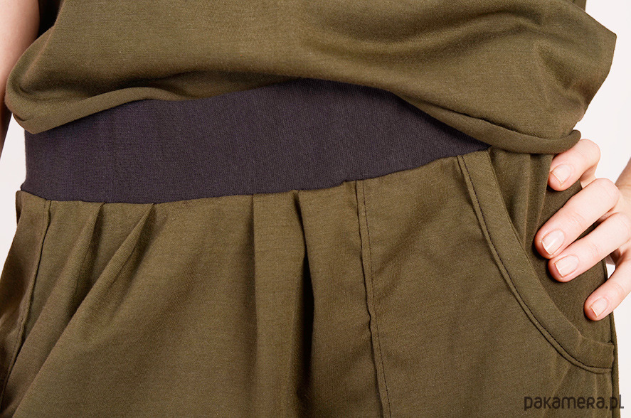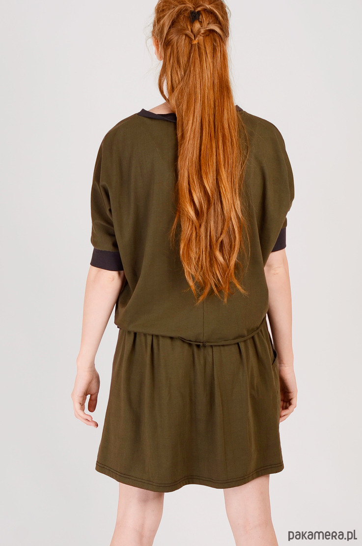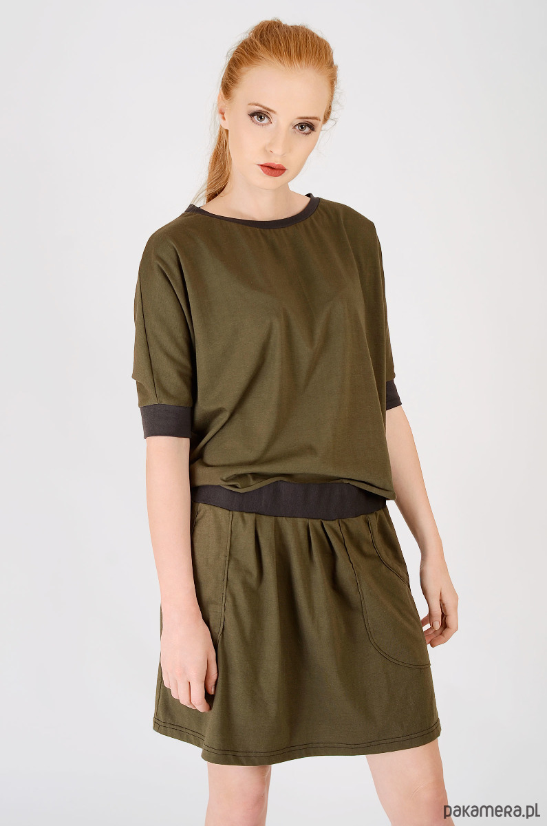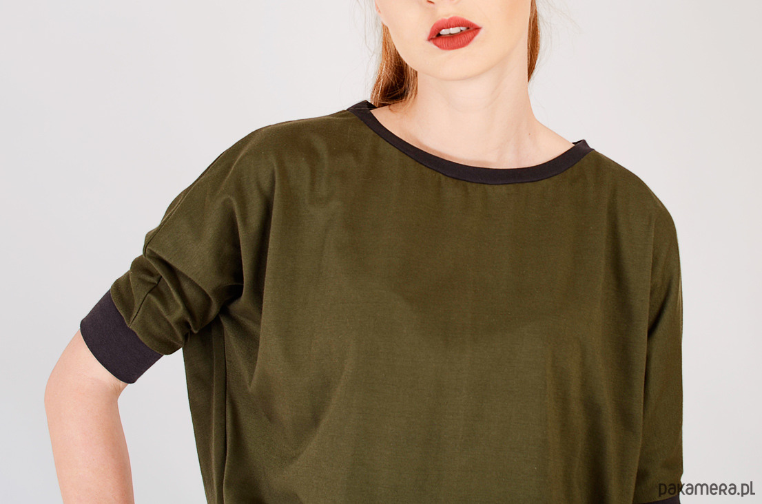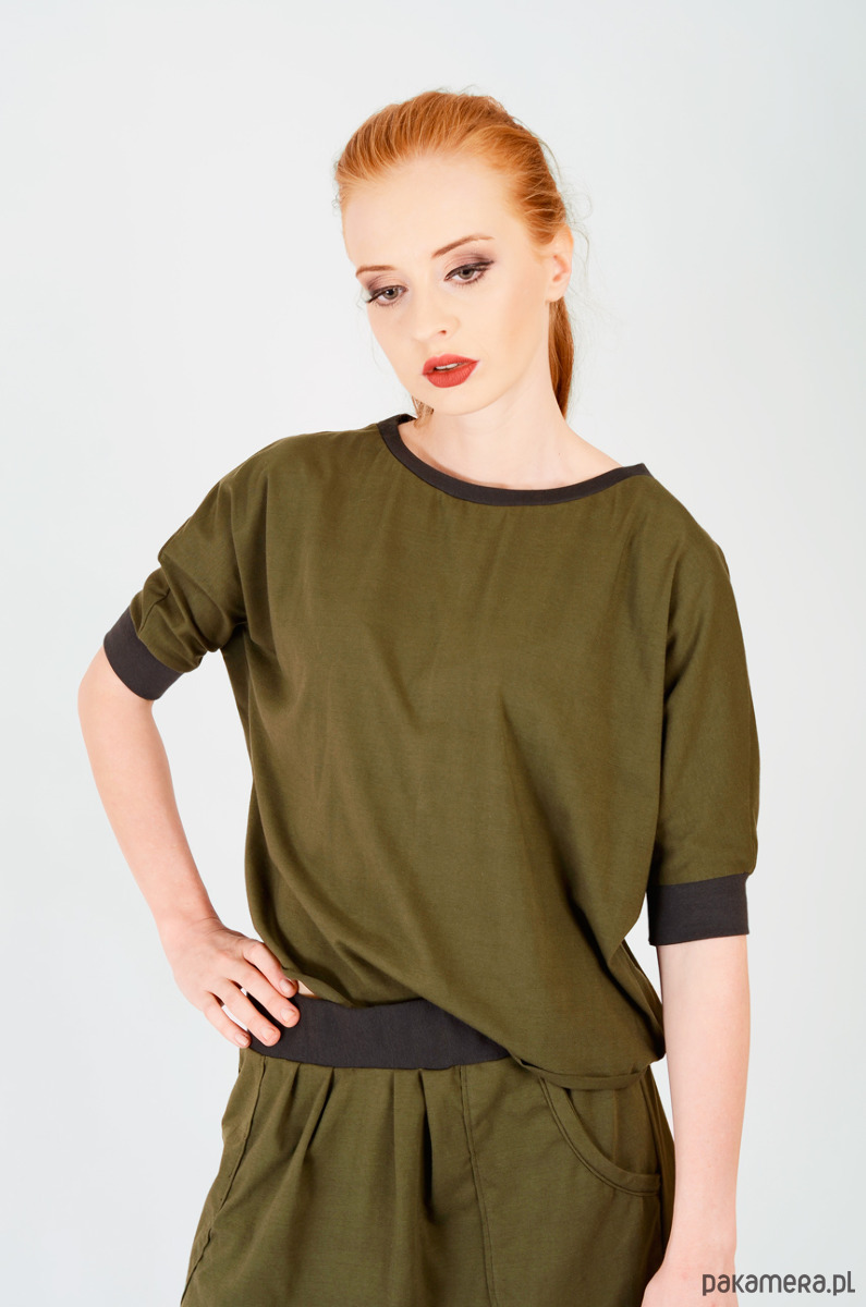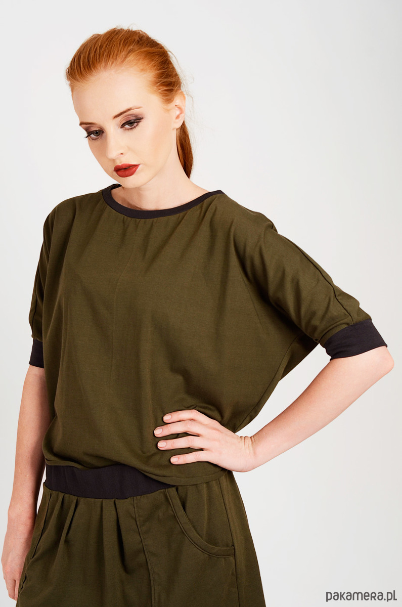 Bluka wykonana z dzianiny bawełnianej z elastanem. Jest średniej grubości, nie prześwituje. Na dole surowe wykończenie, podwinięte i zaprasowane. Przy rękawach oraz dekolcie ściągacz. Pasuje na osoby noszące S, M oraz L. Stworzona w komplecie ze spódniczką.