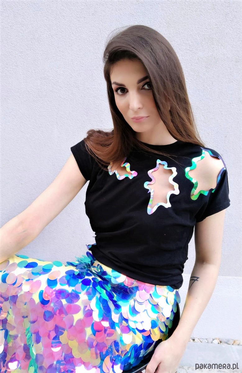 Tshirt jest wykonana z unikatowej tkaniny, która powstała w naszej pracowni. Czarna, miękka dzianina posiada liczne wycięcia, które zostały przyozdobione hologramowymi nadrukami. Holograficzne nadruki pięknie się mienią tęczowymi barwami i nadają koszulce unikatowego charakteru.