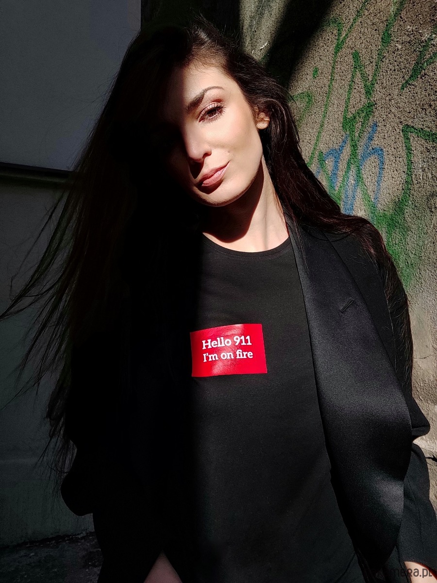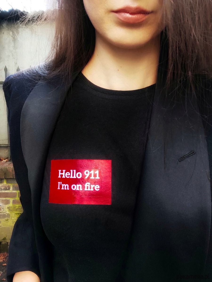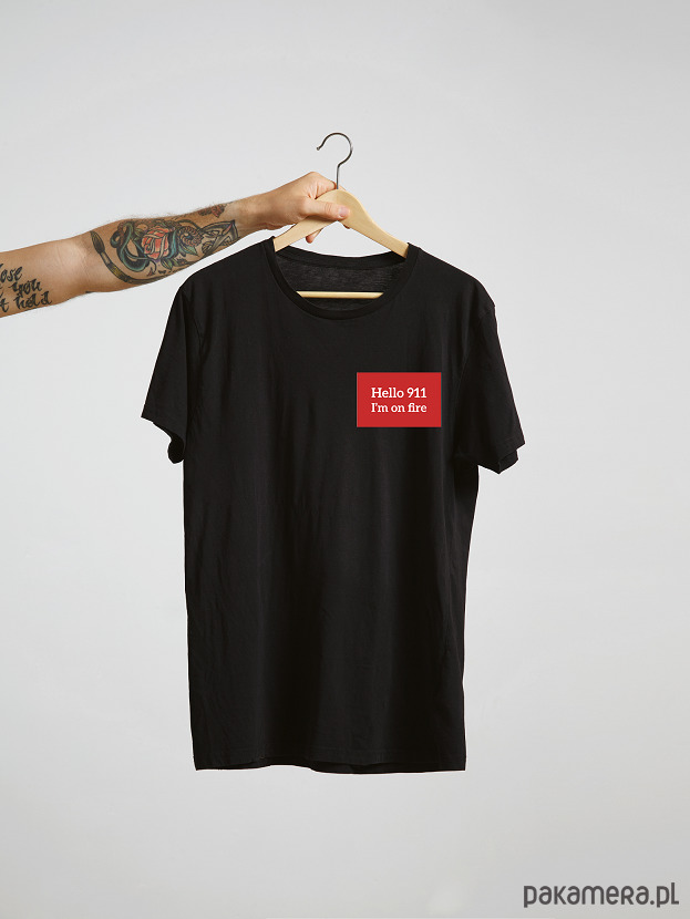 T-shirt bawełniany z nadrukiem Hello 911 I'm on fire .