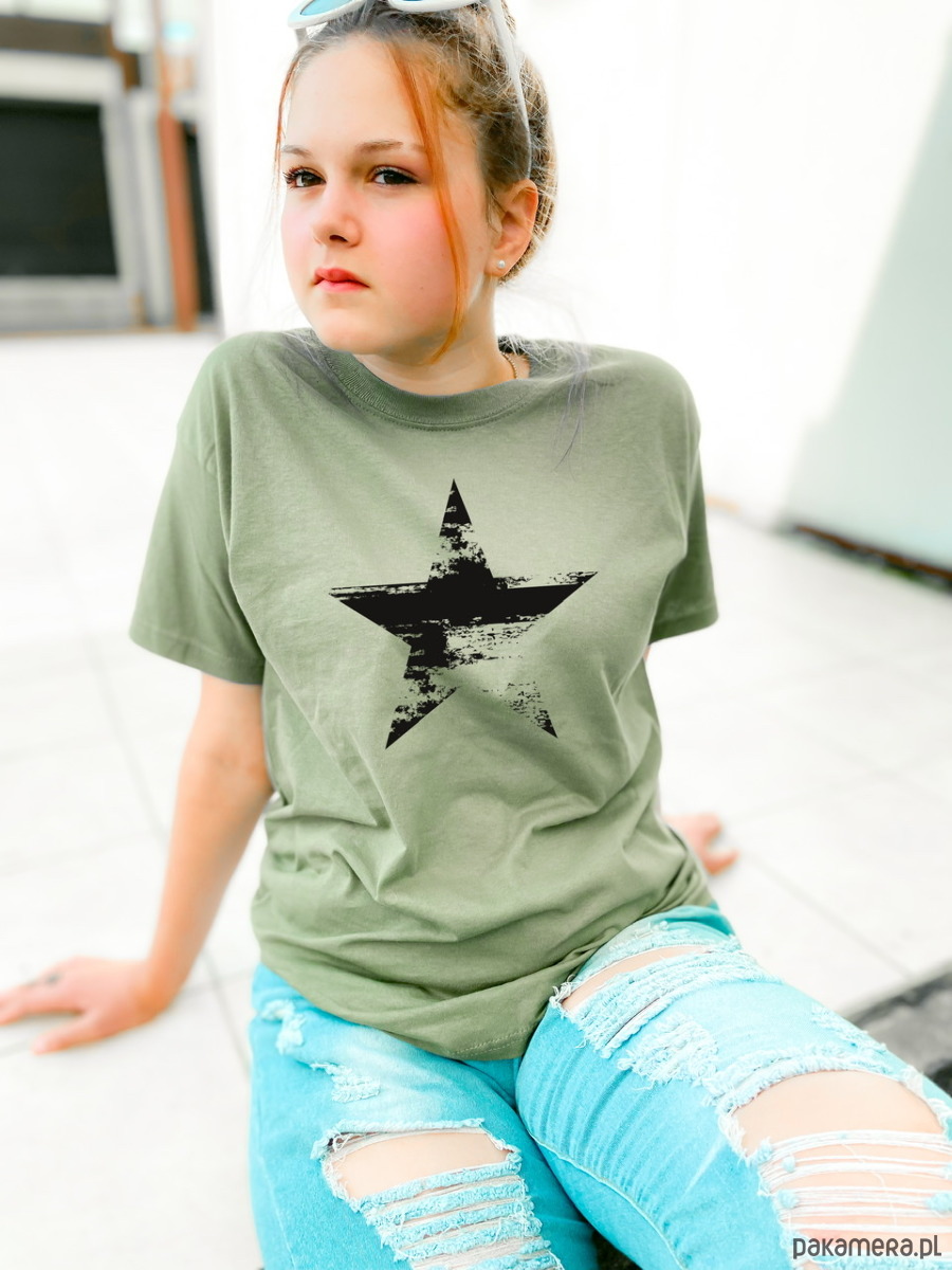 Niesamowita bawełniana koszulka w stylu amerykańskich gwiazd. Ekstra nadruk gwiazdy z efektem „przetarcia”.Super t-shirt doskonale sprawdza się w stylizacjach zarówno sportowych jak i klasycznych. Rewelacyjna jakość bawełny - nie traci kształtu po praniu. Prosty krój.