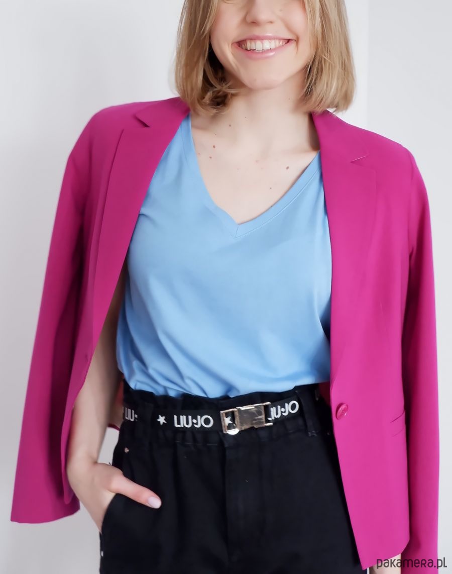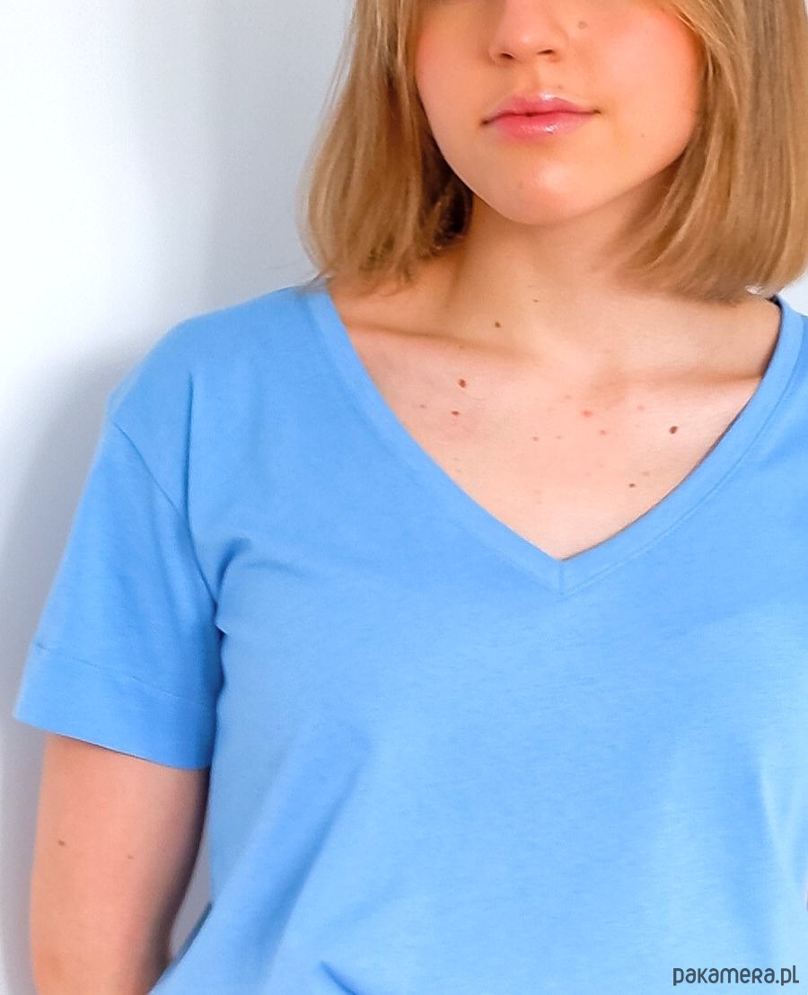 T-shirt MAAM z głębszym dekoltem V w kolorze jasno- niebieskim. Model jest lekko oversized, ale delikatnie dopasowuje się do ciała. Linia ramion jest lekko opadająca. Rękaw z głębszym podłożeniem dzięki czemu możesz go nosić również podwinięty jak mankiet.