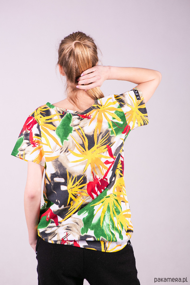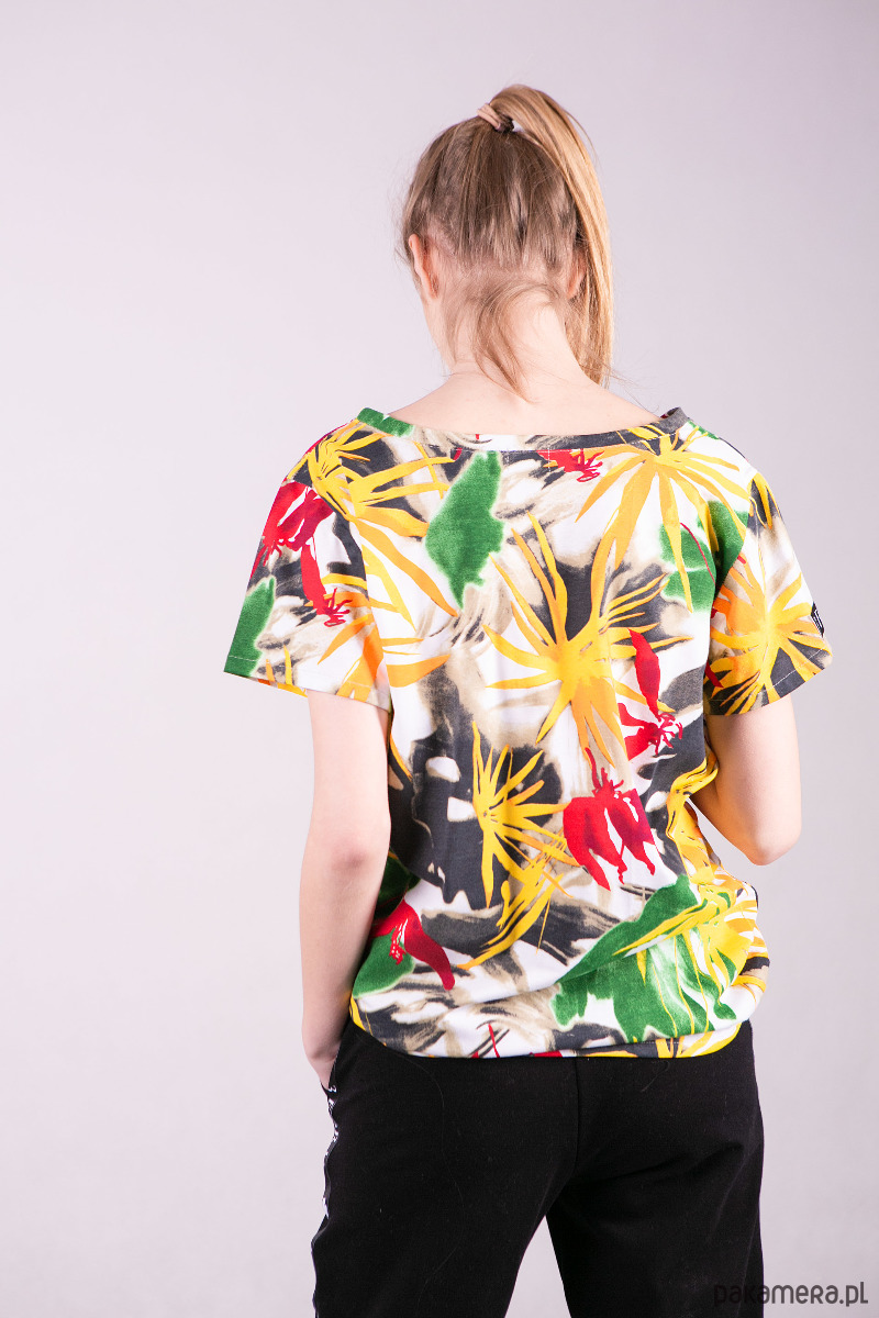 Krótki rękaw oraz głęboki dekolt który jest obszyty zakładana lamówką. Koszulkę można nosić na dwa sposoby
