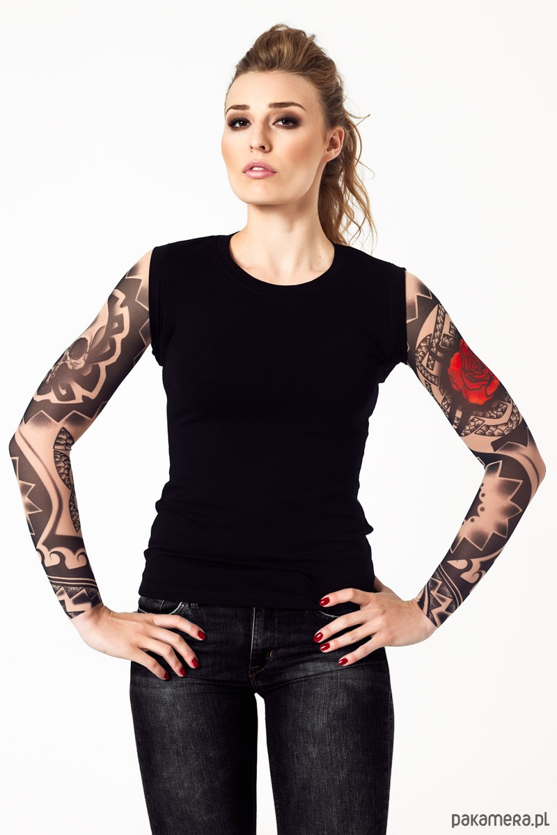 Materiał z którego wykonane są rękawy to przyjemna w dotyku elastyczna siateczka. Jej kolorystyka bardzo dobrze pasuje do koloru skóry, dzięki czemu wykonane na niej nadruki tatuażu wyglądają bardzo realistycznie, nawet z bliskiej odległości. Jest jednocześnie cienka i delikatna oraz mocna i trwała, niełatwo ulega uszkodzeniom. Materiał z którego wykonana jest koszulka to wysokiej jakości mieszanka wiskozy i elastanu, dzięki czemu t-shirt nie tylko komfortowo się nosi oraz dobrze dopasowuje się do ciała, ale też na długo zachowuje oryginalny wygląd. Nadruk tatuażu na rękawkach został wykonany trwałą metodą i nawet przy dłuższym użytkowaniu oraz po praniu kolory zachowują oryginalny wygląd i intensywność.
