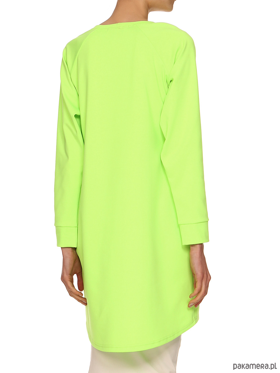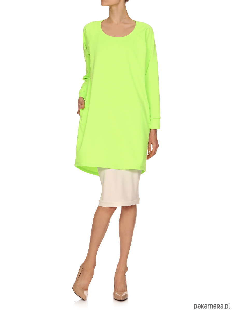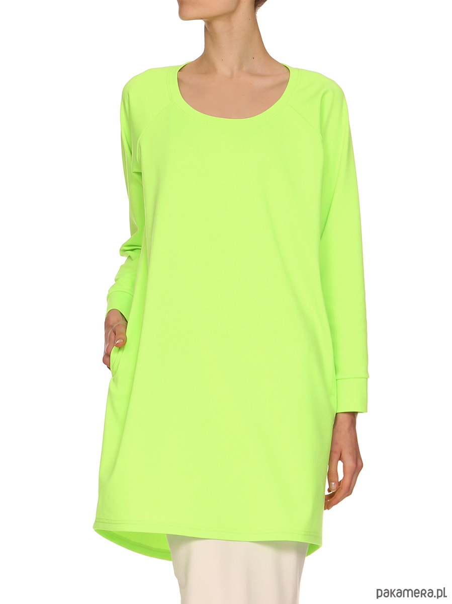 Bluza z kieszeniami. Bluza na co dzień; swobodny i niekrępujący fason; okrągły dekolt; rękawy zakończone mankietami. Wygodna i uniwersalna. Wykonana z wysokiej jakości naturalnej dzianiny; tkanina przyjemna dla ciała, przewiewna. Wiskoza kalandrowana: 65% wiskoza, 30% nylon, 5% spandex. Kolor: neonowozielony RAL6038. Długość rękawa ok. 60 cm; długość tyłu ok. 93 cm; długość z przodu ok. 86 cm. Pranie w pralce w temp. 30 stopni; suszenie w stanie rozwieszonym; prasowanie parą.
