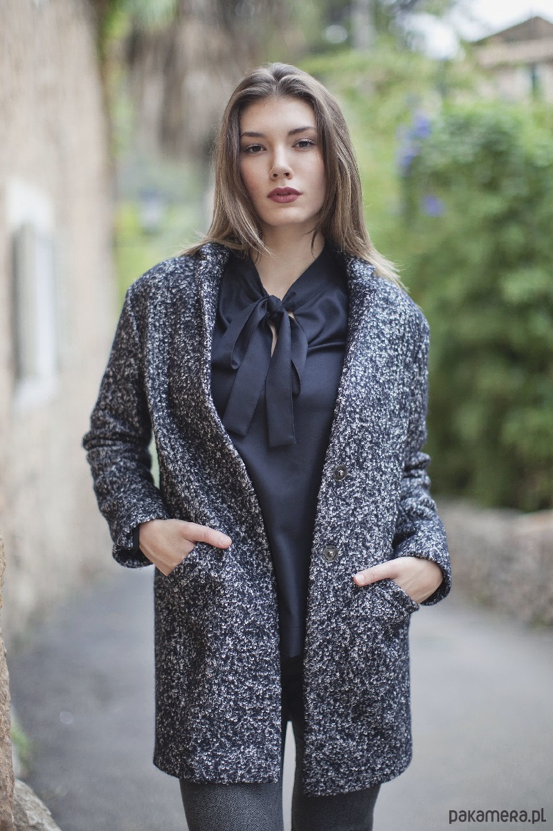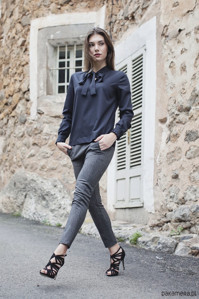Bluzka wykonana z wysoko gatunkowej tkaniny, wiskozy z domieszką poliestru i elastanu w kolorze czarnym. Bluzka ze stójką z charakterystycznymi szarfami do przewiązania. Dekolt oraz rozporki w rękawach wykończone obłożeniem. Mankiety zapinane na zatrzaski typu spring z zakładkami. Bluzka stanowi idealne połączenie elegancji, jakości, designu i komfortu.