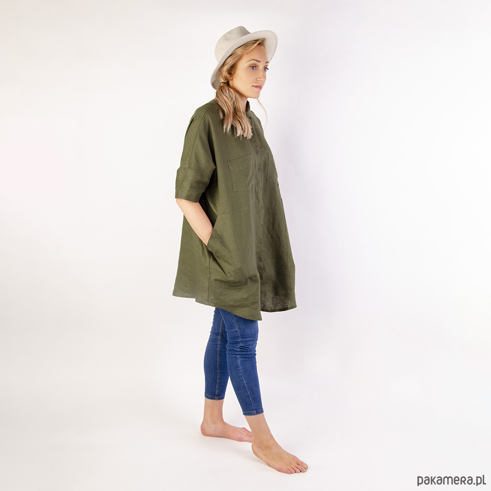 Lniana, koszulowa tunika oversize. Wykonana w Polsce, z wysokiej jakości, zmiękczanej tkaniny lnianej. Modelka na zdjęciu ma 1,75 wzrostu.