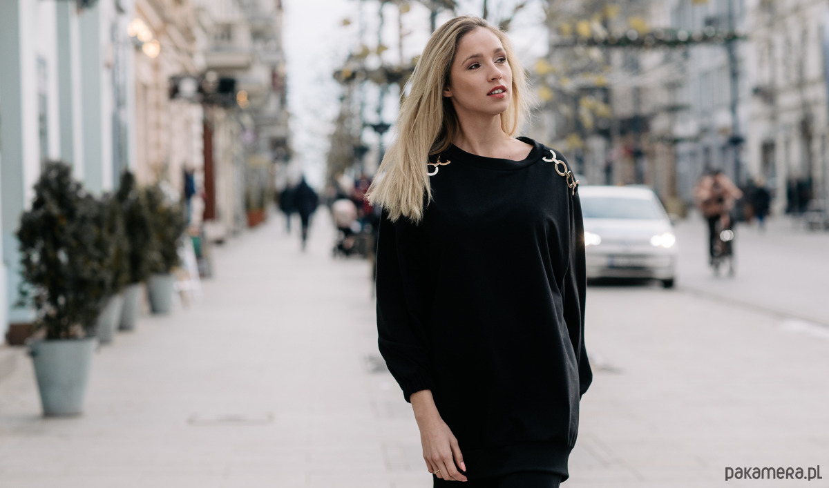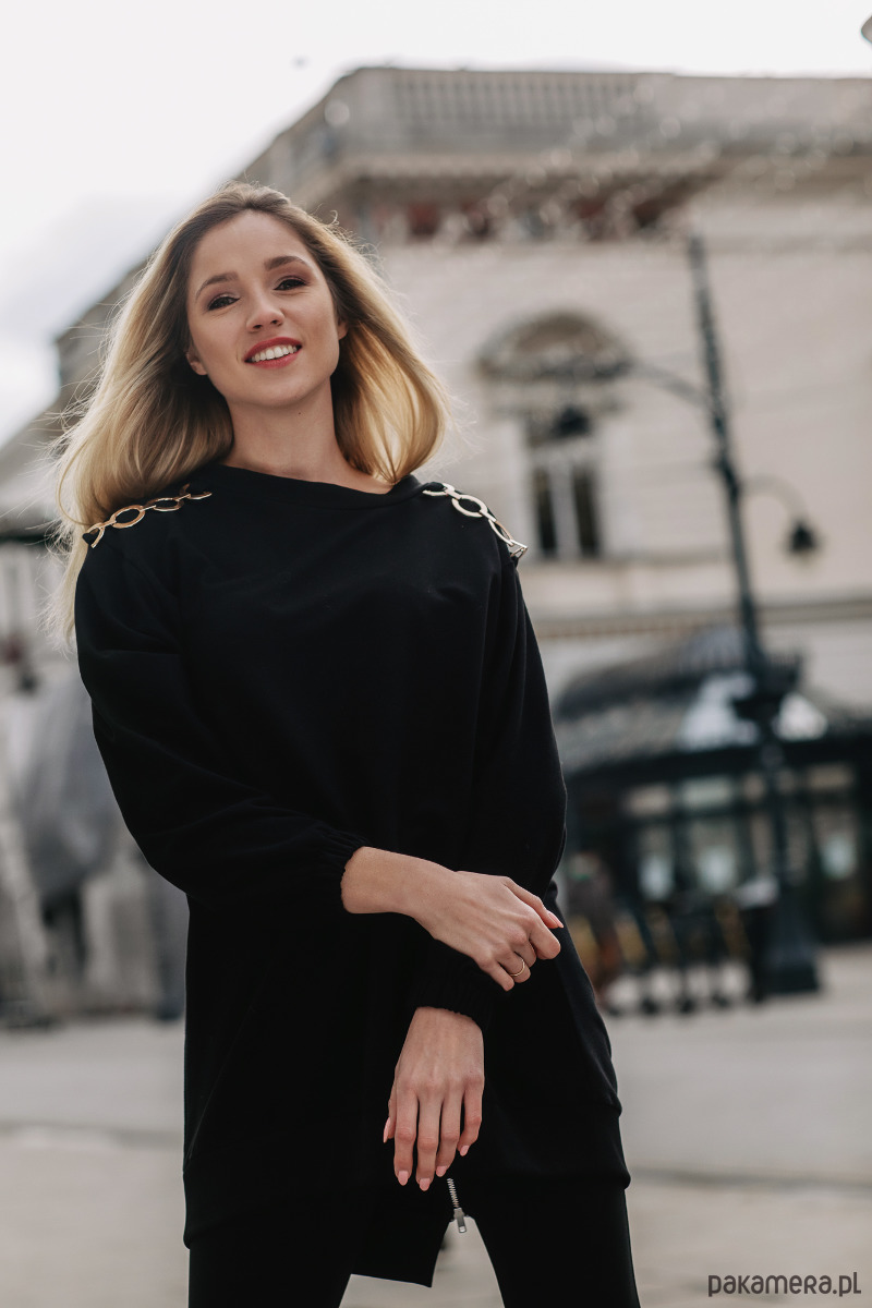 Tunika oversize wykonana z wysokogatunkowej, przyjemnej w dotyku dzianiny. Na ramionach ozdobna aplikacja przypominająca ogniwa łańcucha. Dla dodatkowej wygody w szwach bocznych są dwie kieszenie. Tunika o swobodnej formie pozwala zaszaleć z jej stylizacją. Można nosić ją do spodni, świetnie wygląda również z legginsami.
