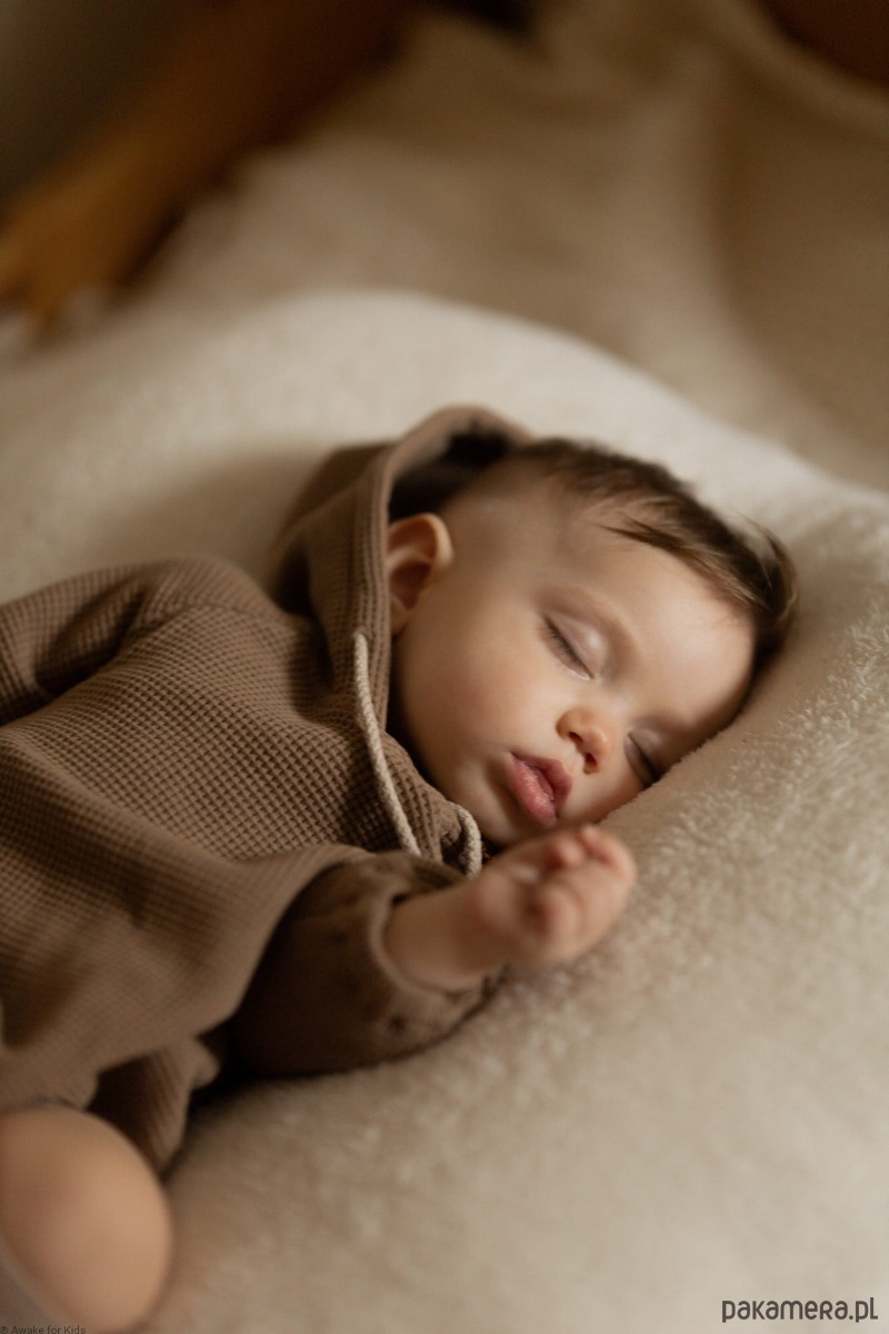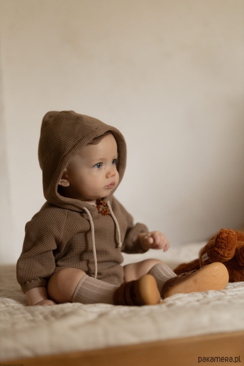 Bluzobody dla dziecka uszyte z miękkiej organicznej dzianiny wafelkowej w odcieniu beżu taupe.