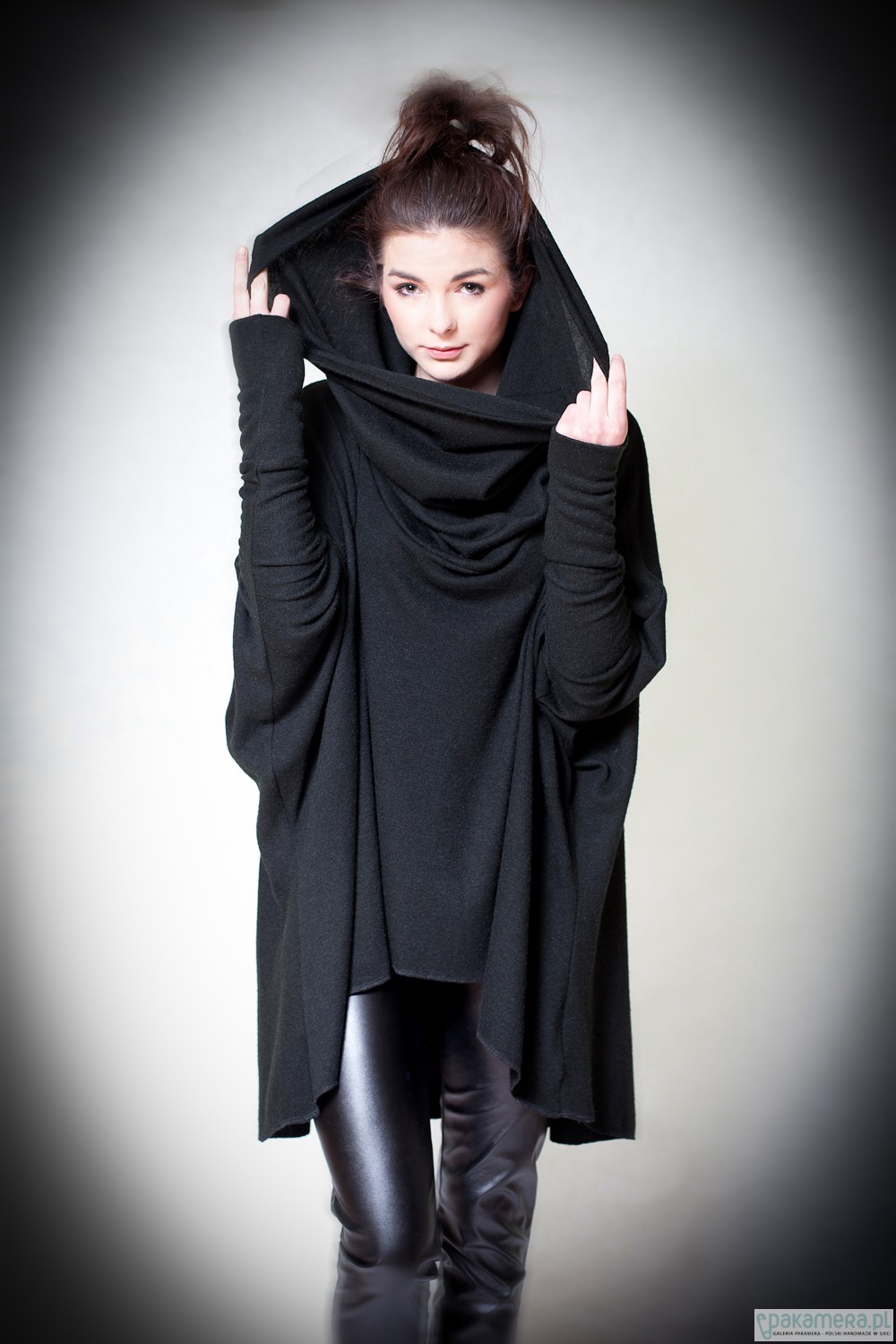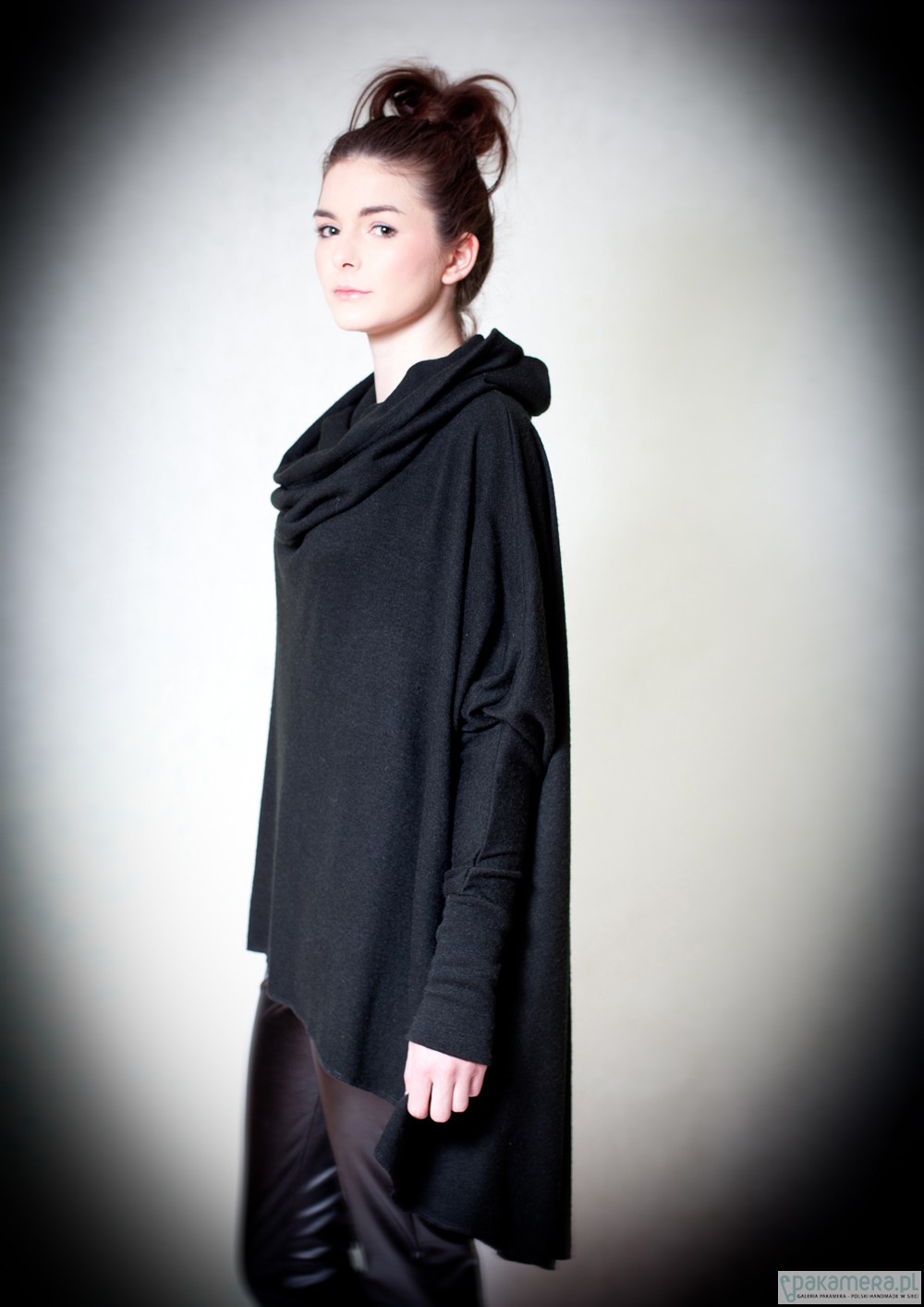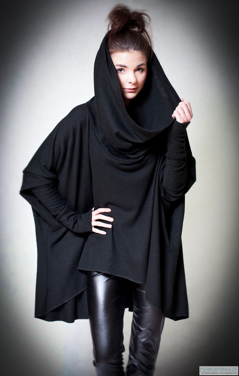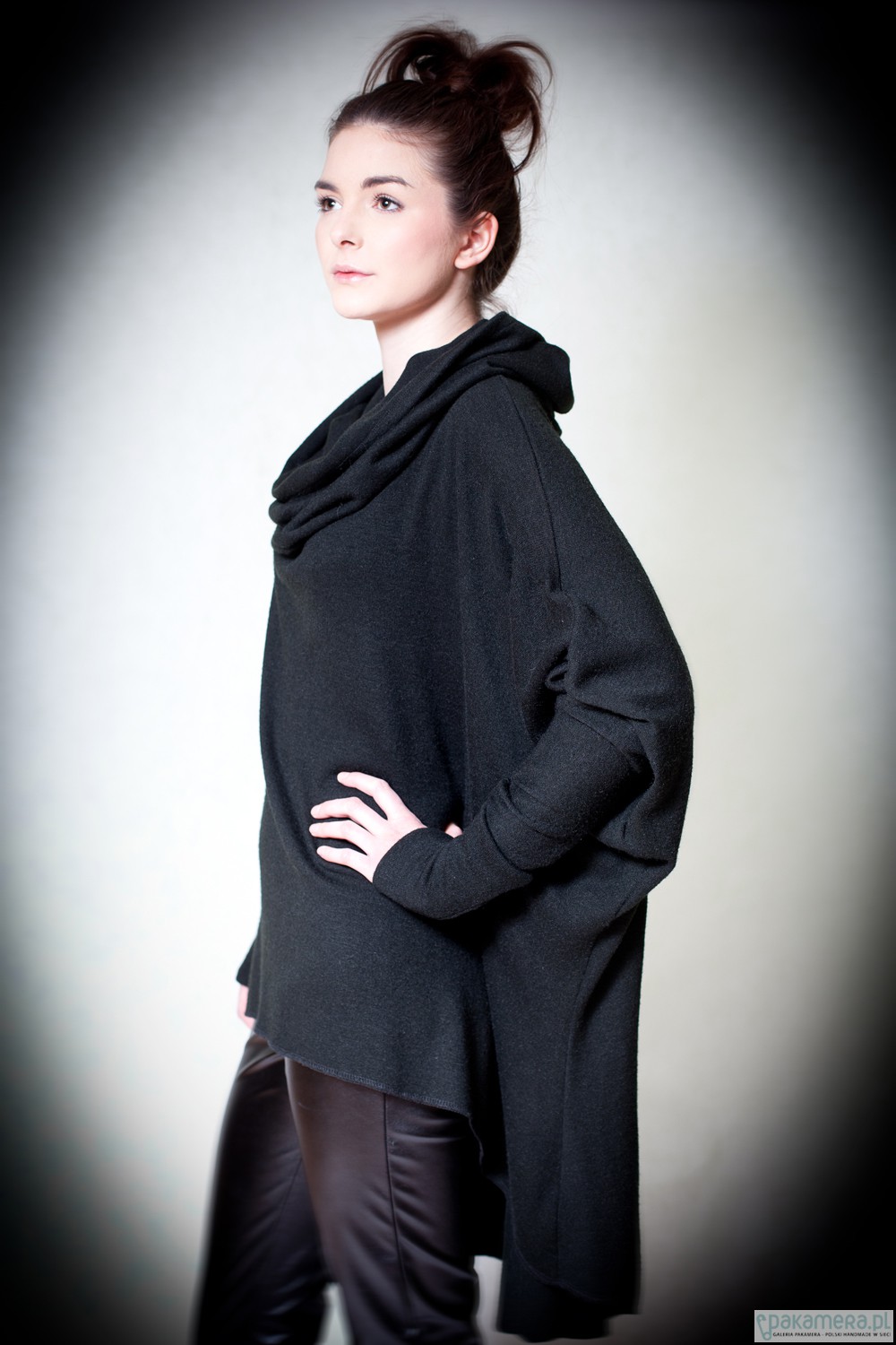 Sweter-ponczo w stylu oversize . Tył dłuższy od przodu . W całości uszyty z wysokiej jakości dzianiny sweterkowej. Duży komin może być również stosowany jako kaptur . Kolor - czerń . Skład: 50% akryl, 50% poliester Rozmiar uniwersalny najlepiej leży na sylwetkach od S-L , może być za duży dla XS i osób poniżej 160cm . Istnieje możliwość dopasowania wymiarów , poprzez kontakt mailowy lub informację w komentarzu zamówienia. Modelka ze zdjęcia ma 175cm
