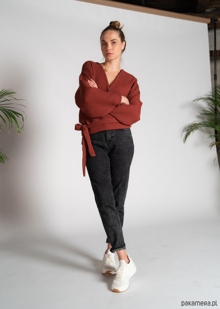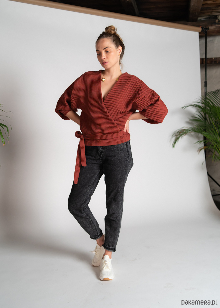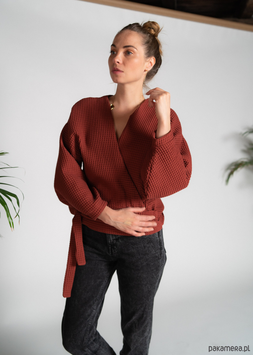 Kopertowa bluza uszyta z tkaniny o pięknej fakturze.