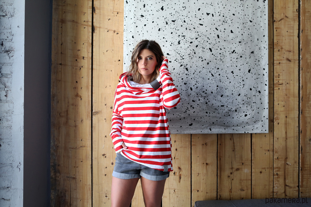 Bluza posiada luźną formę z dopasowanymi rękawami zakończonymi dziurką na kciuka. Kieszenie w szwachbocznych.