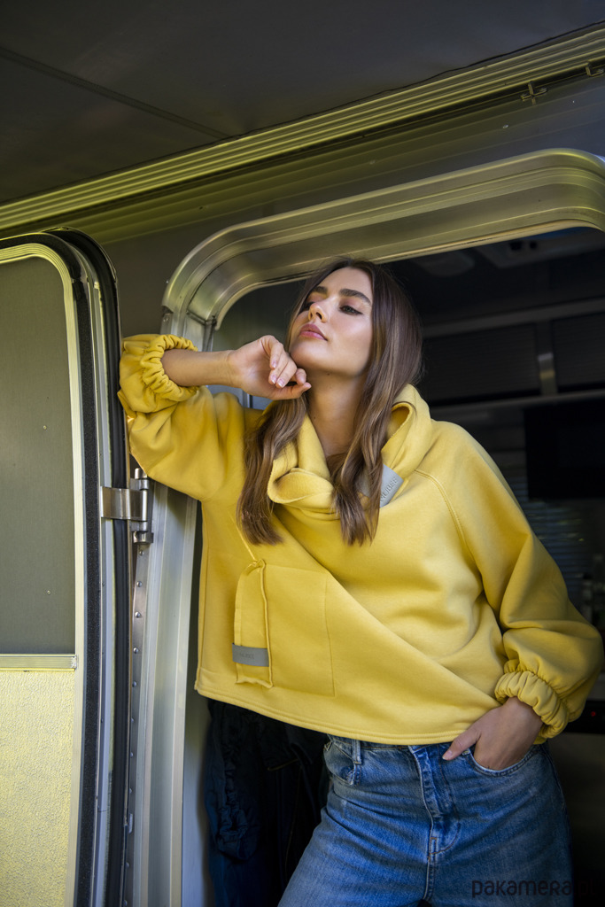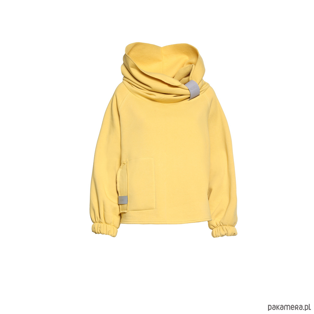 Bluza ma charakterystyczną, dużą, niezapinaną kieszeń na brzuchu wykończoną metką z eko skóry. Rękawy reglanowe, szerokie, wykończone gumką dzięki czemu tworzy się charakterystyczna bufka. Komin jest spinany chwytaczem* ze skóry naturalnej. ( Jeśli chciałabyś/chciałbyś chwytacz ze skóry ekologicznej prosimy o wpisanie tej informacji w komentarzu do zamówienia. Dostępne kolory: czarny lub szary).