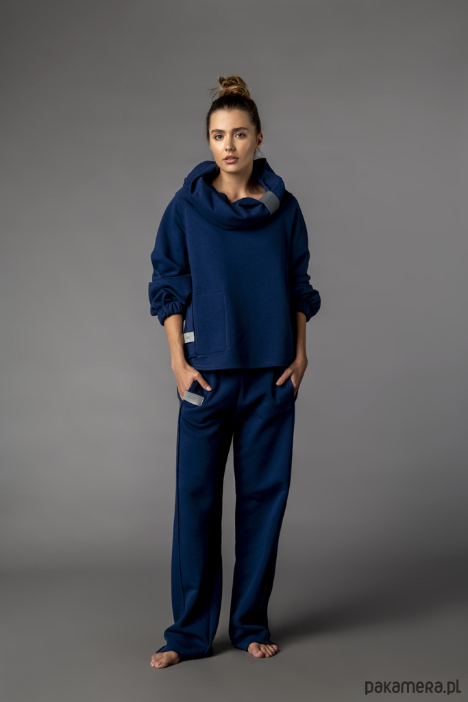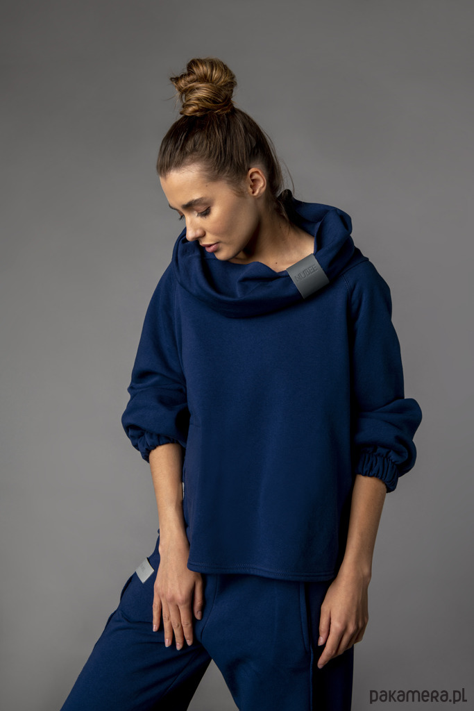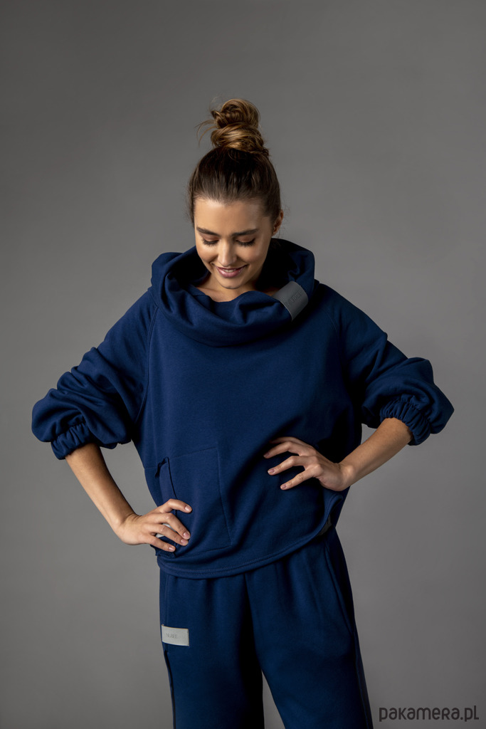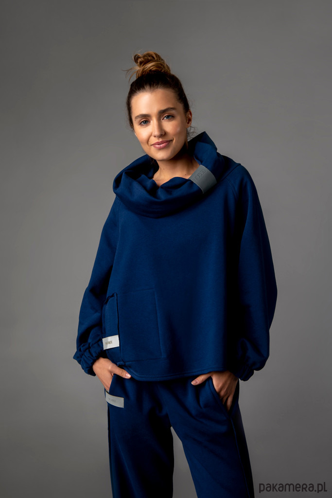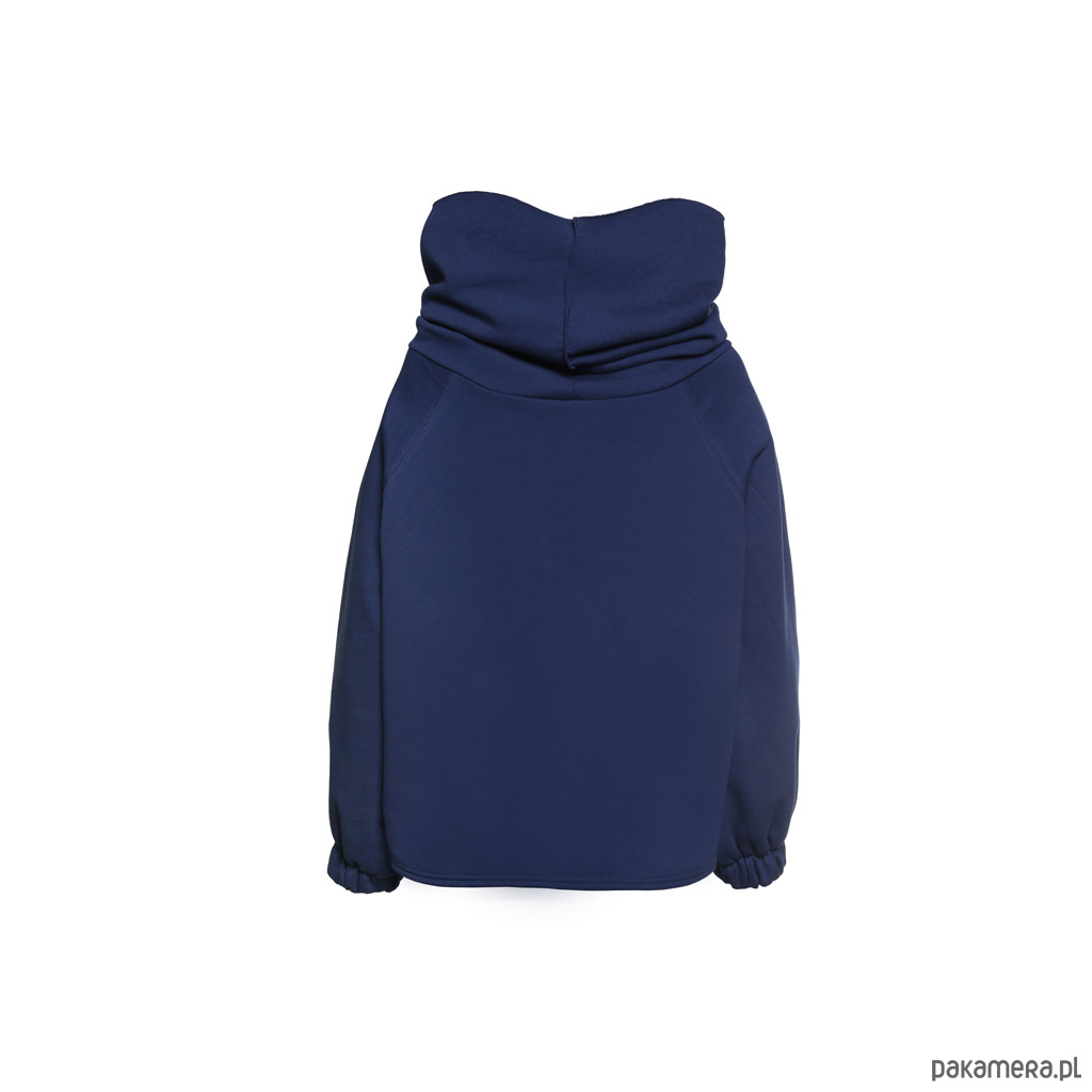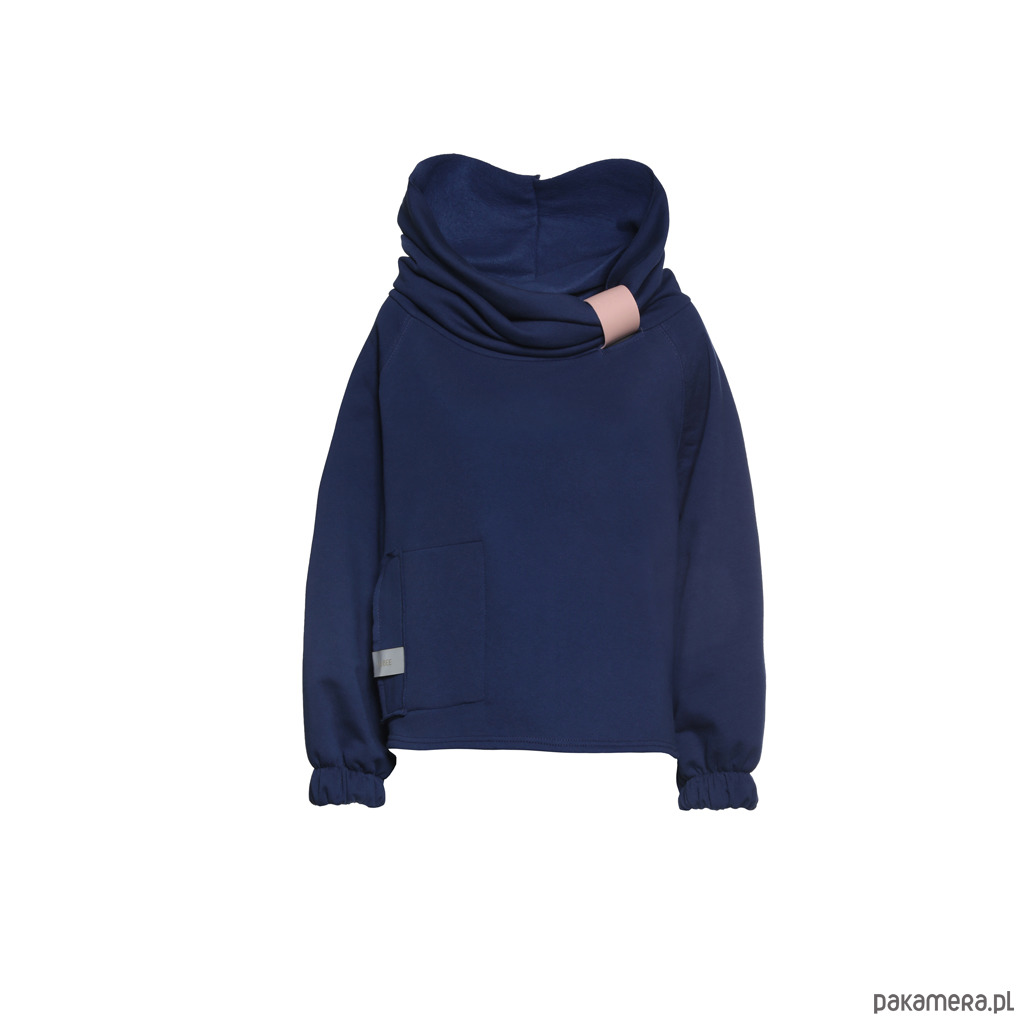 Bluza ma charakterystyczną, dużą, niezapinaną kieszeń na brzuchu wykończoną metką z eko skóry. Rękawy reglanowe, szerokie, wykończone gumką dzięki czemu tworzy się charakterystyczna bufka. Komin jest spinany chwytaczem* ze skóry naturalnej. ( Jeśli chciałabyś/chciałbyś chwytacz ze skóry ekologicznej prosimy o wpisanie tej informacji w komentarzu do zamówienia. Dostępne kolory: czarny lub szary).
