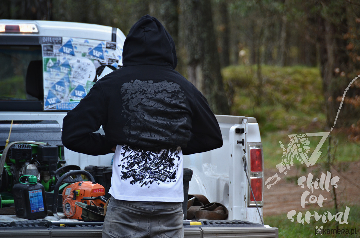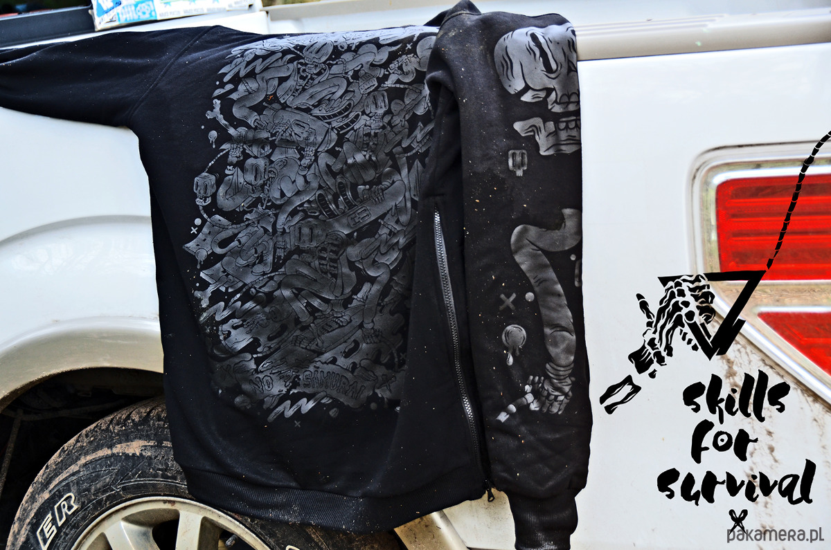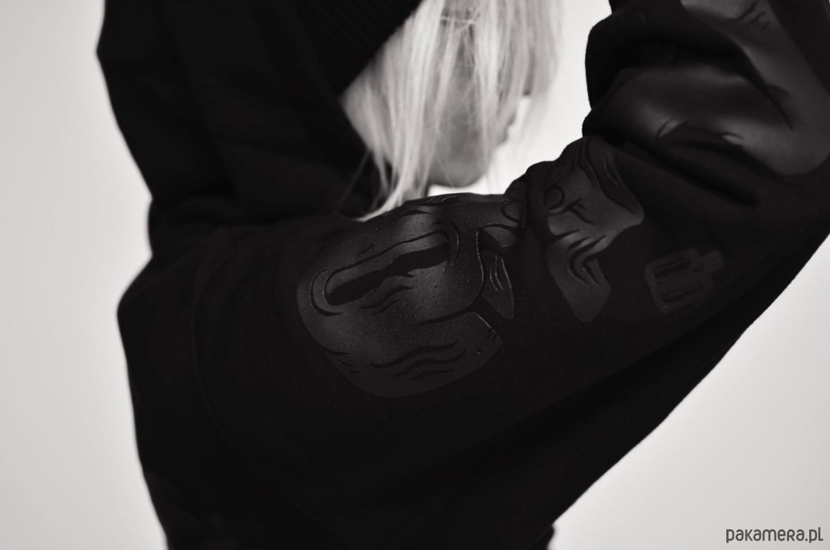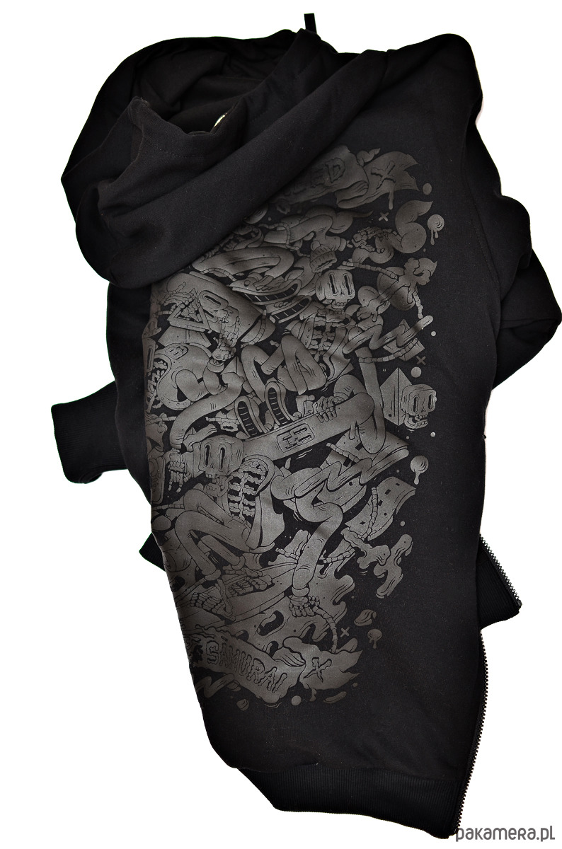 Nadruk sitodruk na plecach, na prawym rękawie i na klatce.