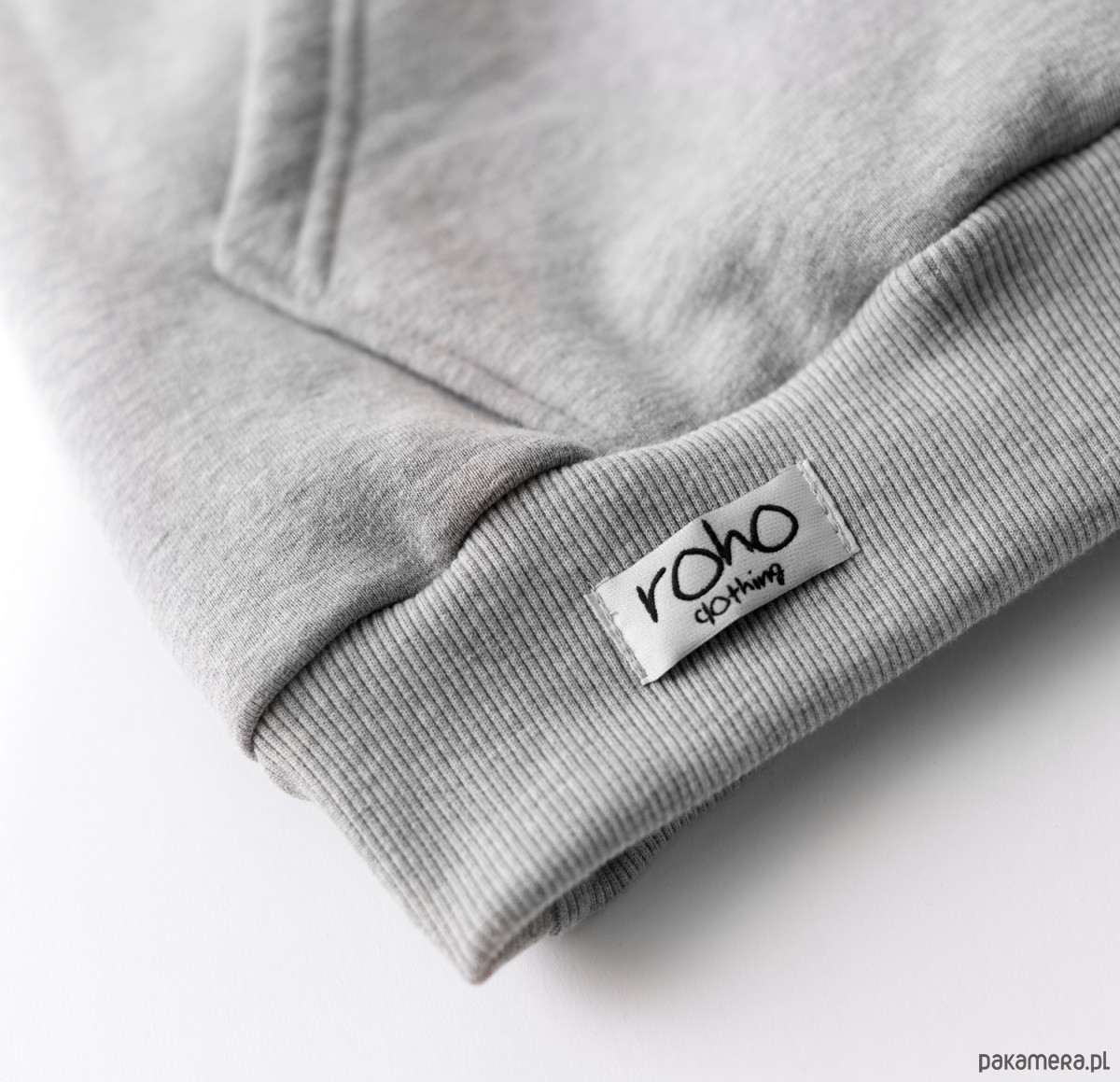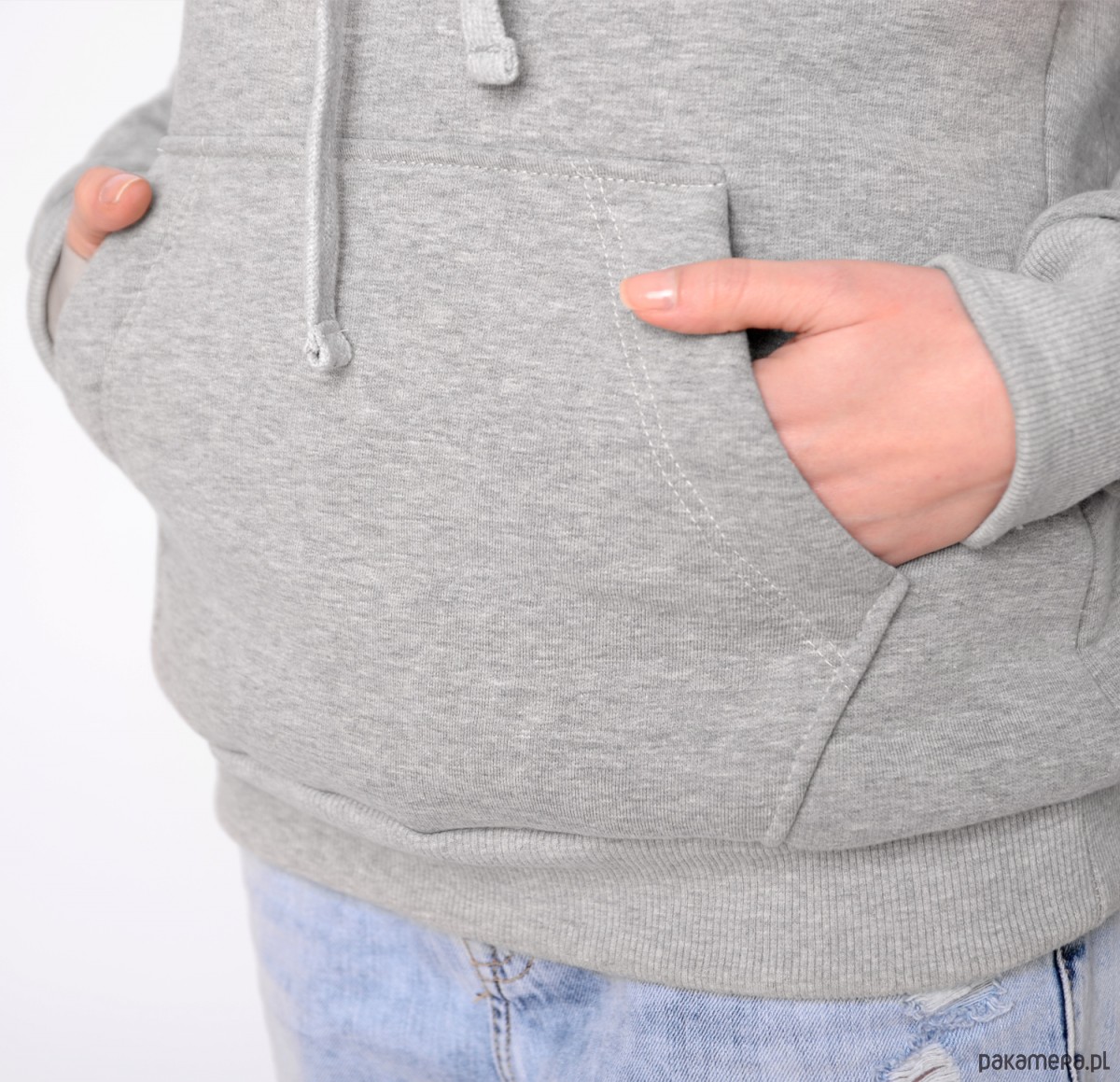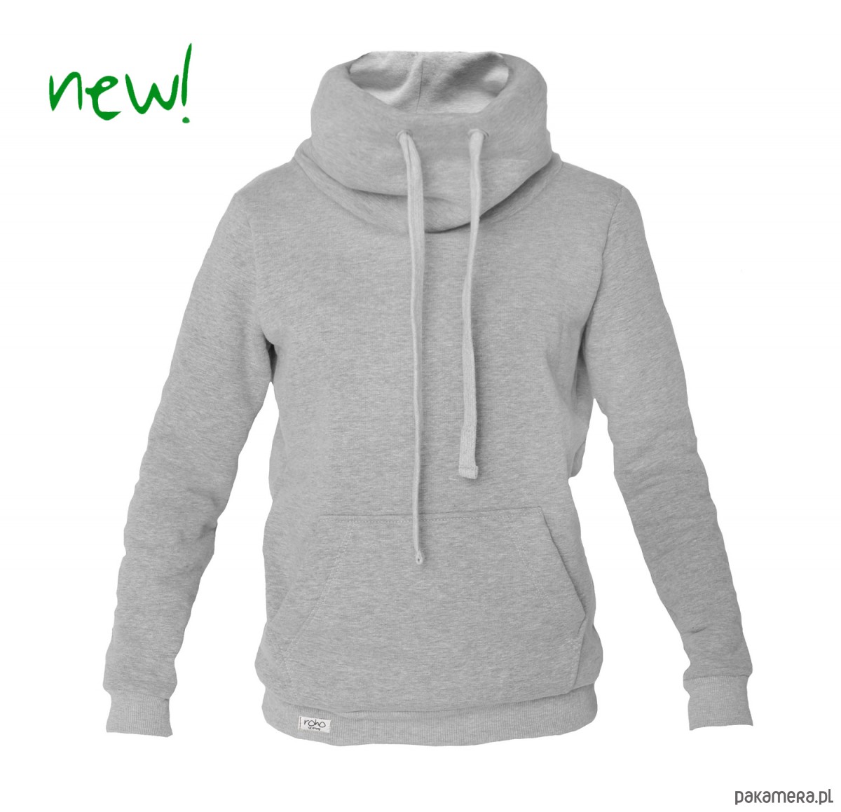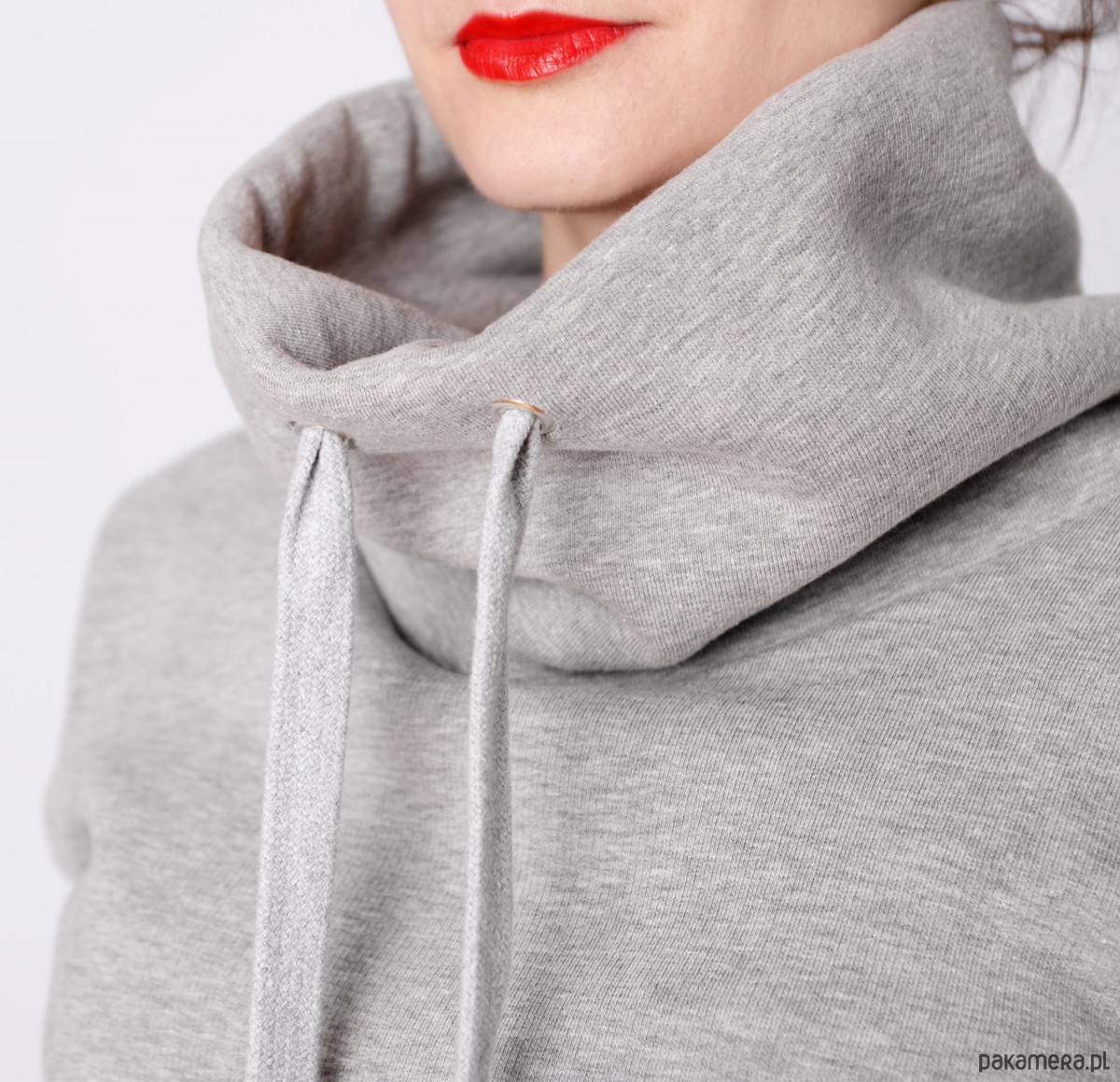 Sportowa bluza typu kangur z dość sztywnym dużym szalem-kominem. Wykonana z ciepłej dzianiny dresowej z białym puszkiem po lewej stronie. Z przodu naszyte kieszenie, w komin wciągnięty gruby sznurek. Bardzo wygodna, niekrępująca ruchów, z powodzeniem może zastąpić kurtkę w cieplejsze dni. Przyjemny szary odcień bluzy pasuje do wielu kolorów. Na dolnym ściągaczu naszyta firmowa metka.