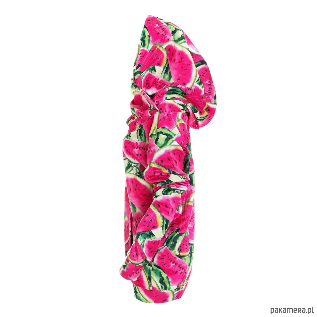 Kolejna odsłona naszego bestsellerowego printu. Kolorowy nadruk z różowymi arbuzami≥ przywołuje lato nawet w środku najbardziej srogiej zimy, dodaje energii i rozwesela. Zupełnie nowy, innowacyjny krój sprawi, że nie będziesz chciała jej zdjąć. Obszerny kaptur przywodzi na myśl bajki gdzie zakapturzone bohaterki przemykały pod osłoną nocy.