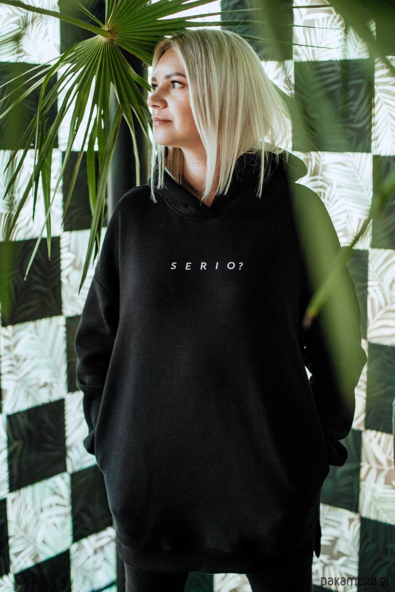 Długa, bardzo ciepła bluza z napisem SERIO? o bardzo luźnym, oversize’owym kroju.