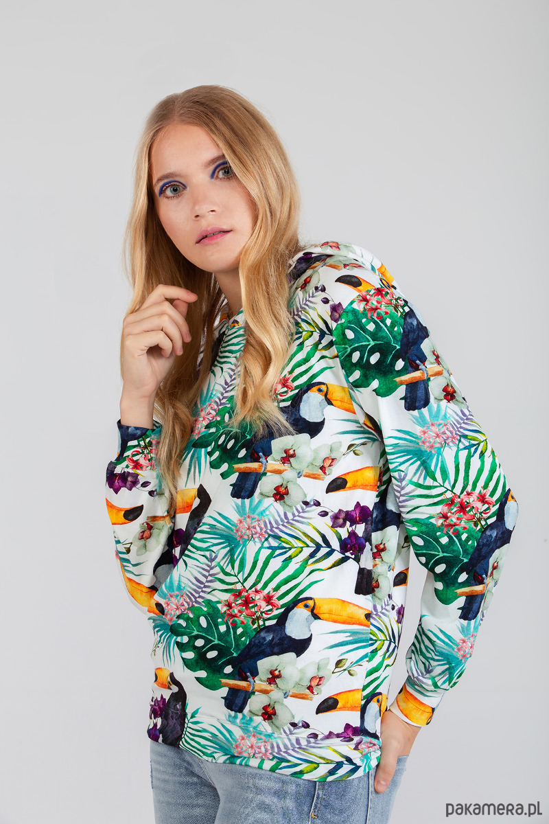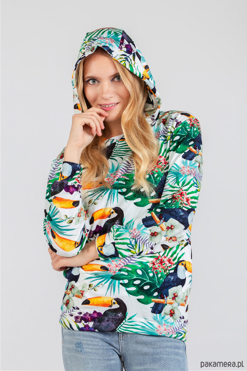 Bluza w tukany z kapturem. Do noszenia do dżinsów, legginsów. Idealna na każdą porę roku. Materiał zadrukowany nie będzie się spierał Materiał: bawełna 100% polskie prać 30 stopni pralka