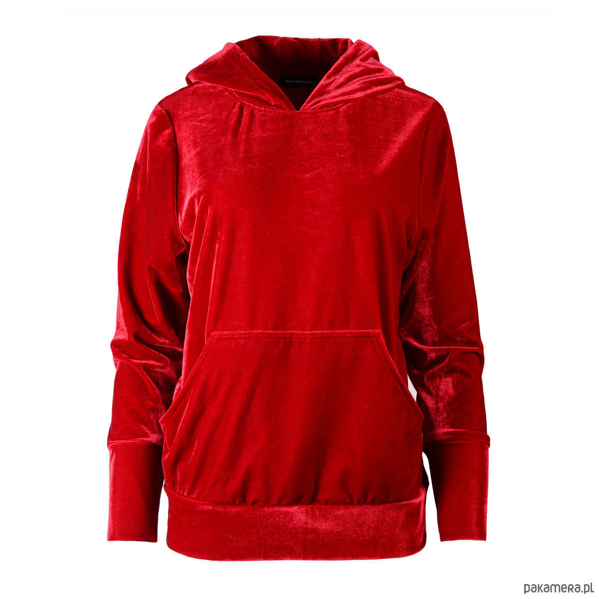 Czerwona bluza z kapturem i kieszenią. Wykonana z przyjemnej welurowej tkaniny.