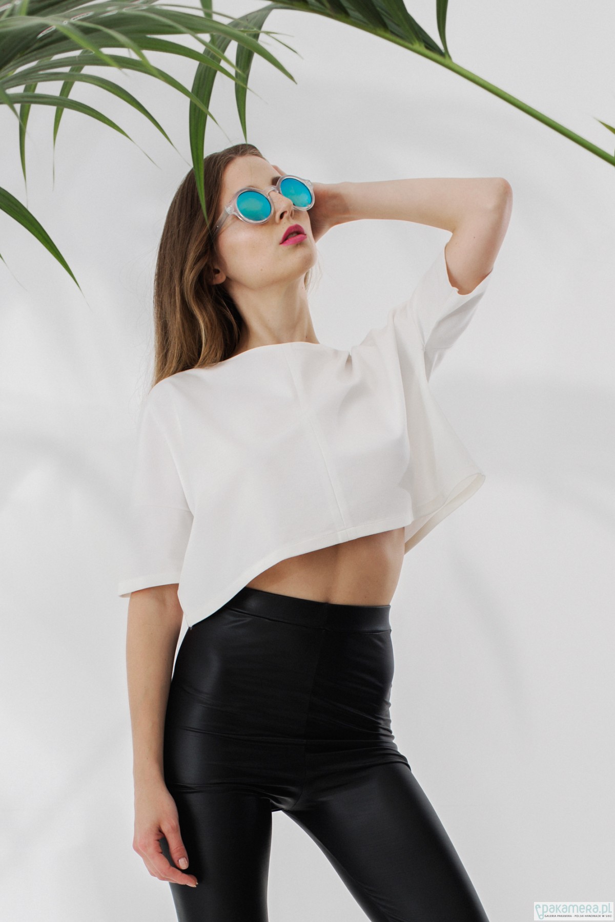 Krótka, szeroka bluza uszyta z eleganckiej , mięsistej tkaniny w kolorze naturalnej bieli. Przez środek przodu pionowe przeszycie, rękaw lekko obniżony, krótki. Dekolt w delikatną łódkę. XS dł. całkowita 41 szerokość pleców 52 S dł. całkowita 41 szerokość pleców 54 M dł. całkowita 42 szerokość pleców 56 L dł. całkowita 42 szerokość pleców 58