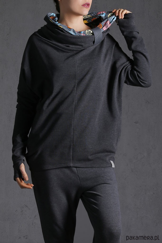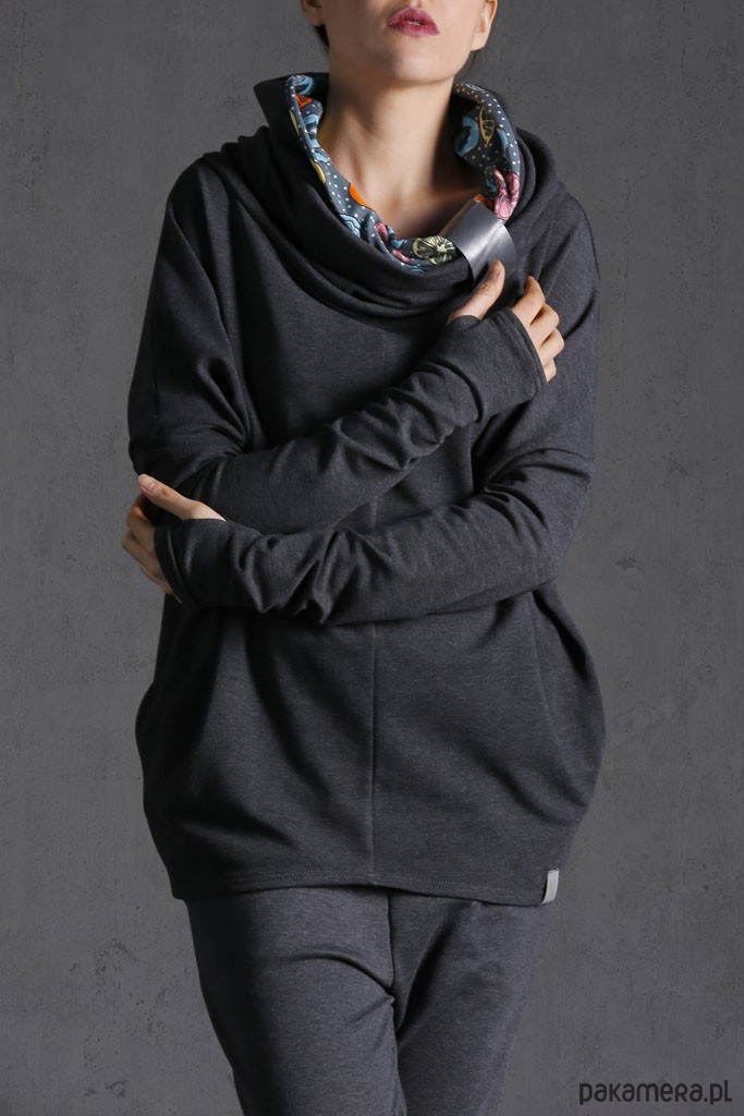 NUBEE - KOMIN BLUZA z dzianiny z prostym kominem, który można nosić jako kaptur. Kieszenie w szwach. Komin jest spinany chwytaczem ze skóry naturalnej (* kolor chwytacza, ze względu na unikatowość skóry oraz brak powtarzalności dobiera projektant) WYMIARY: OneSize dobra na S/M/L - długość całkowita : 60 cm - szerokość : 65 cm - obwód w bicepsie: 30 cm KOLOR: Grafitowy, wnetrze komina takie jak na zdjęciu PRZEPIS PRANIA: prać w pralce w temperaturze do 30 st. C w dobrych środkach piorących, można odwirować, należy ZAWSZE ODPINAĆ CHWYTACZ ZE SKÓRY NATURALNEJ MODELKA: wzrost 173 cm
