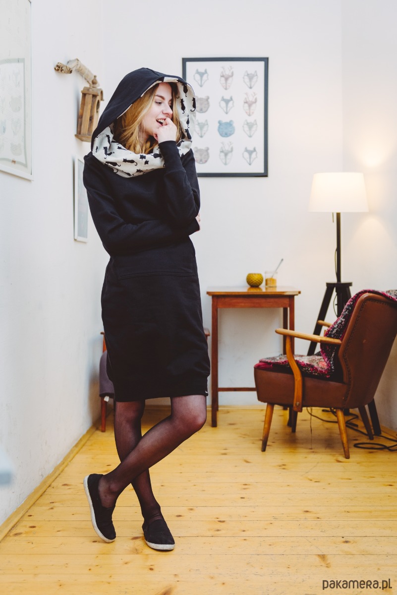 Czarna sukienko- tunika z miękkiej dzianiny z dużym kapturem. (85% bawełna 15% elastan)
