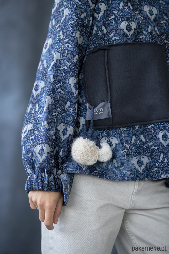 Bluza ma charakterystyczną, dużą, niezapinaną kieszeń na brzuchu wykończoną żakardową metką, którą ozdobiliśmy typowymi dla Nubee detalami - zawieszkami z pomponami nawiązującymi do planet.