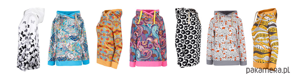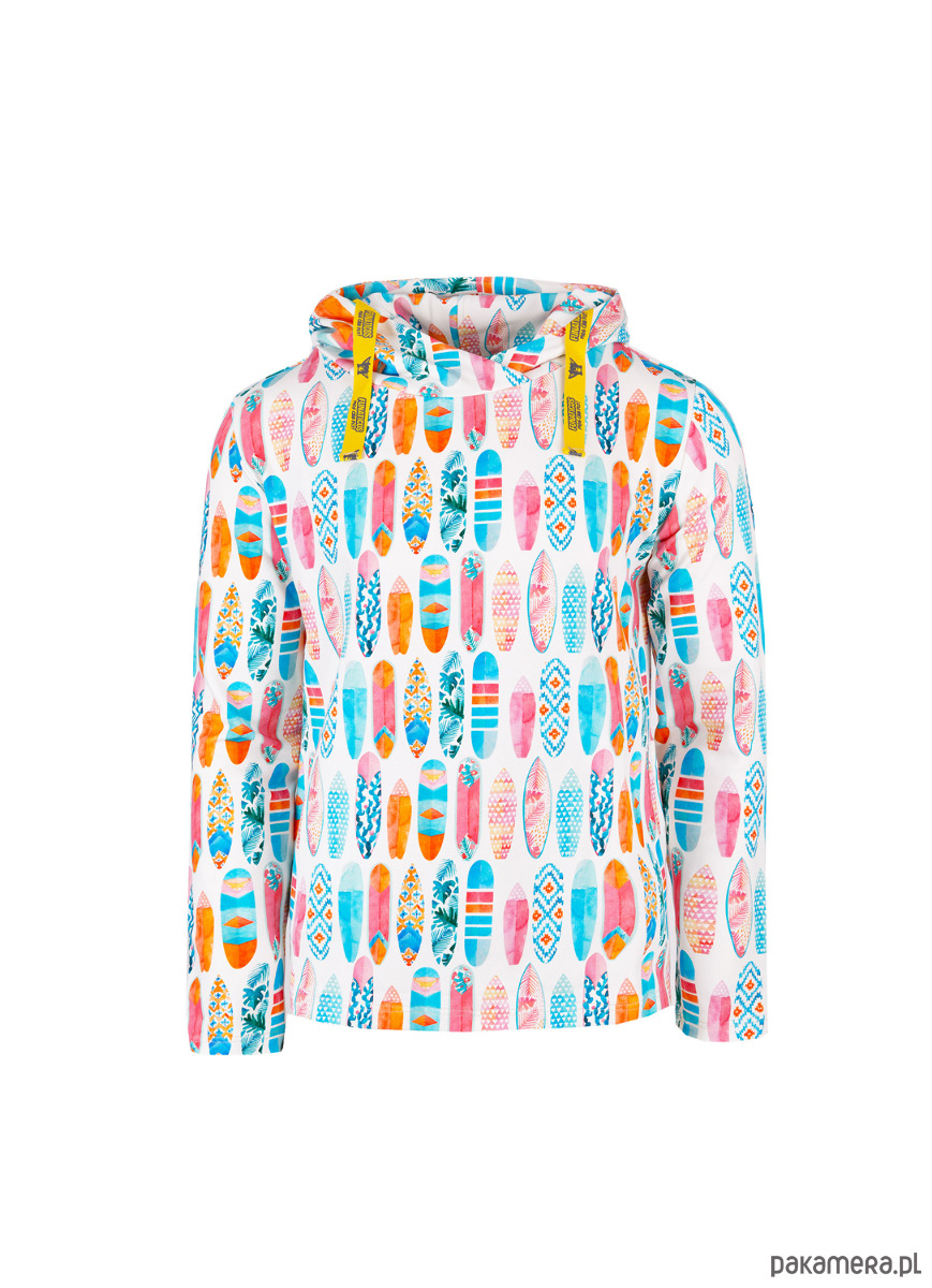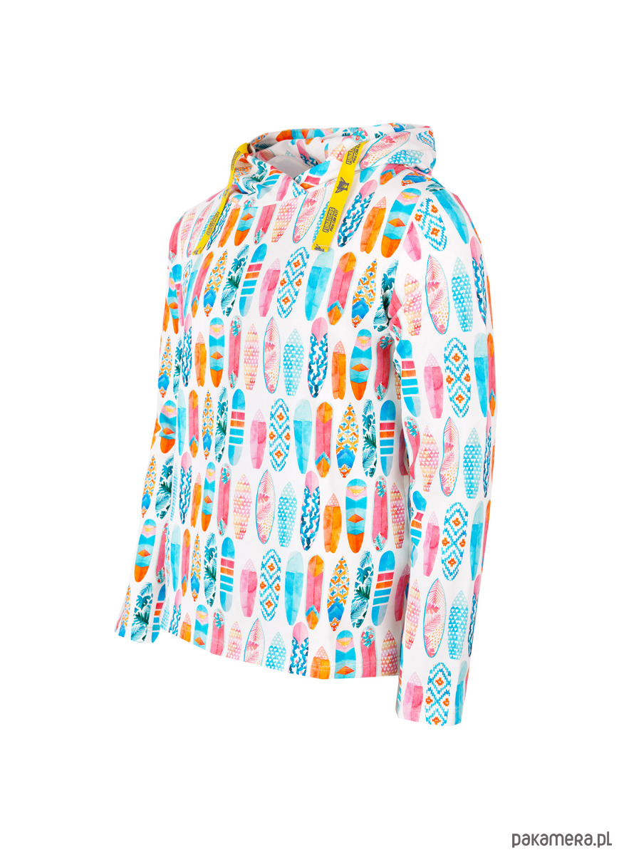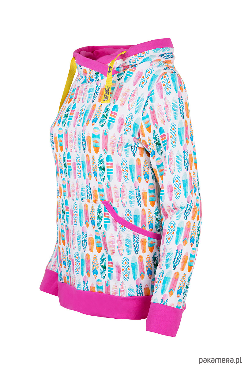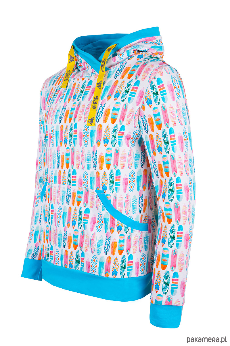 Kolorowa bluza kangurka w surferskich klimatach z cyfrowo drukowanej dzianiny z domieszką elastanu wyprodukowana w Polsce, w małej krakowskiej manufakturze. Bluza z motywem kolorowych desek surfingowych. Dostępna w wersji "kangurka" z wykończeniem turkusową dzianiną lub "na surowo" z bocznymi kieszeniami, bez ściągaczy. Możliwość wyprodukowania ciepłej bluzy rozpinanej z zamkiem (gramatura 320).