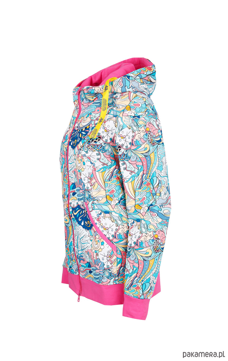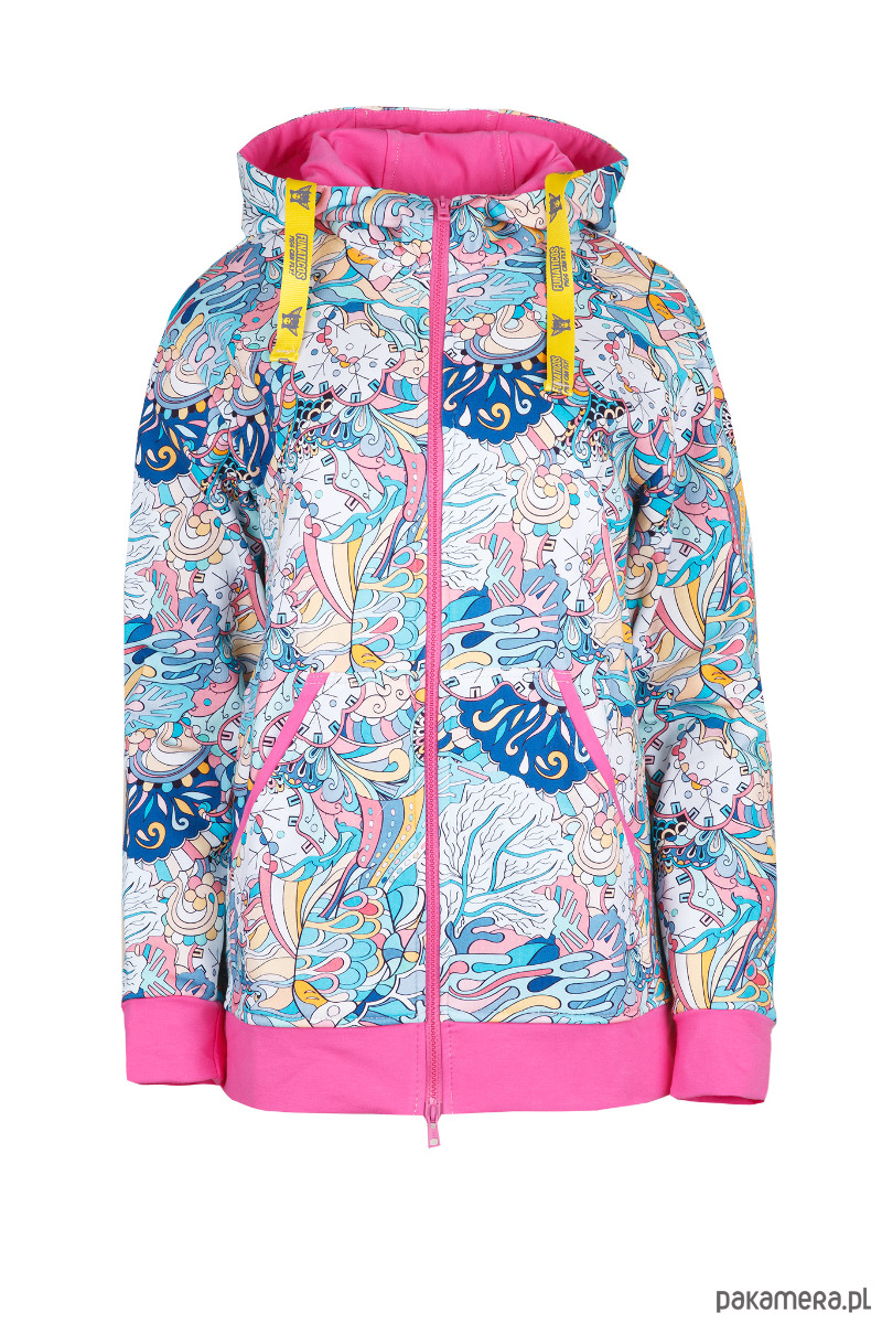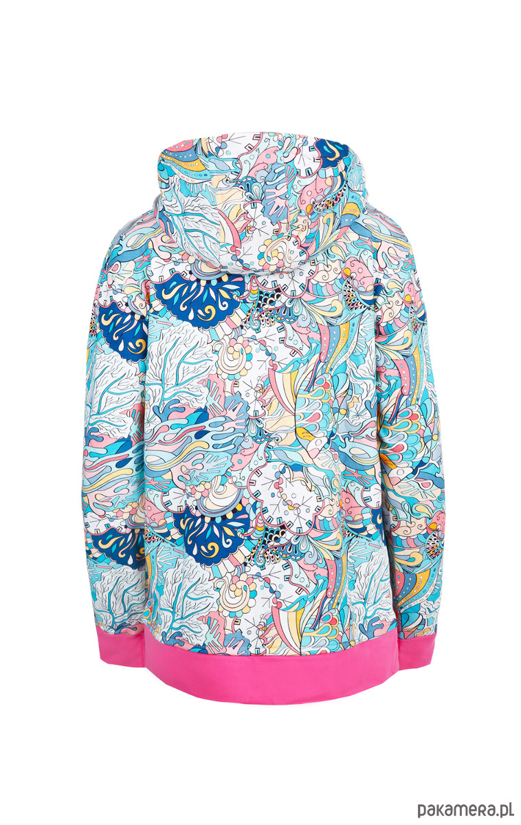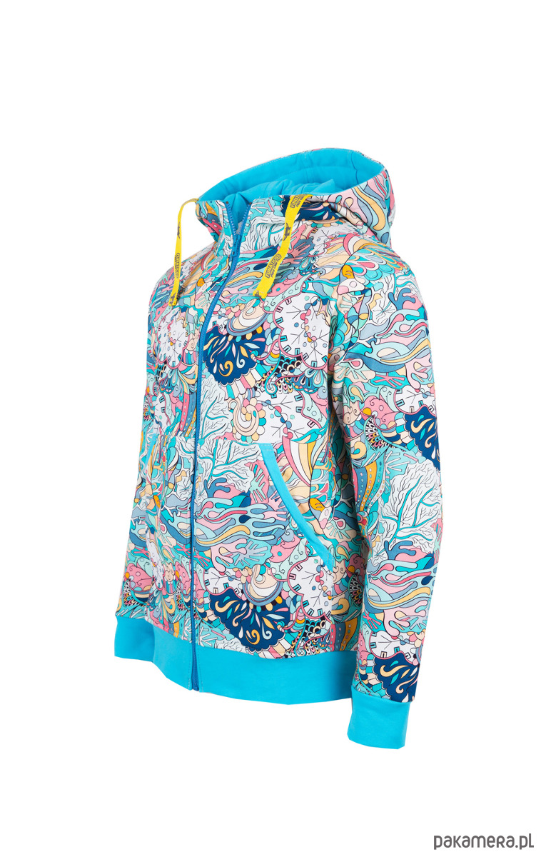 Rozpinana, ciepła bluza w surferskich klimatach. Wykona z drukowanej cyfrowo dzianiny drapanej (97% bawełna / 3% elastanu) o gramaturze 320 g/m2.
