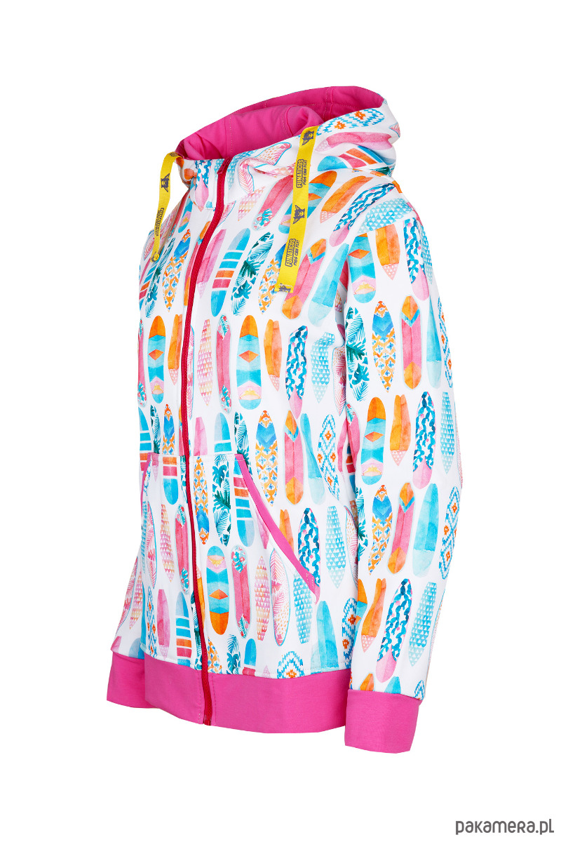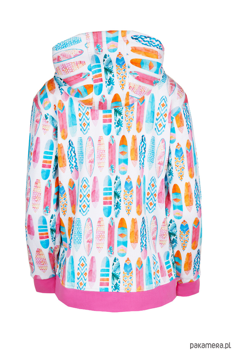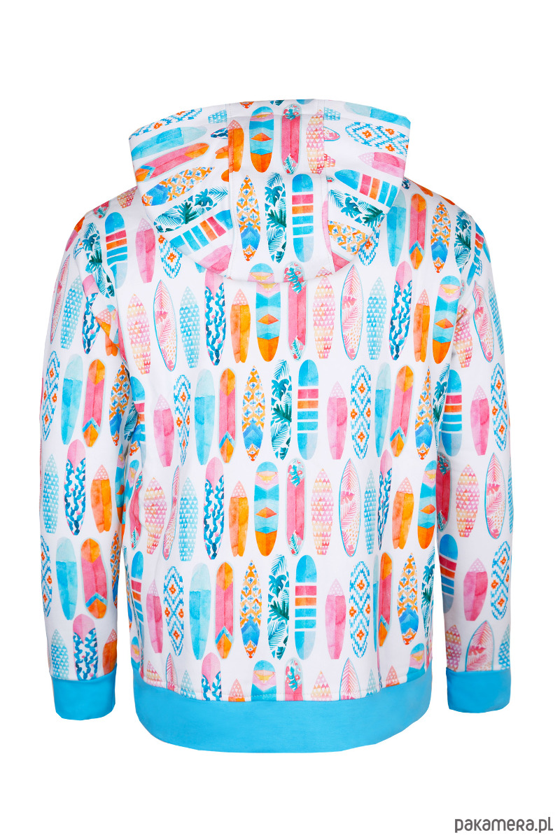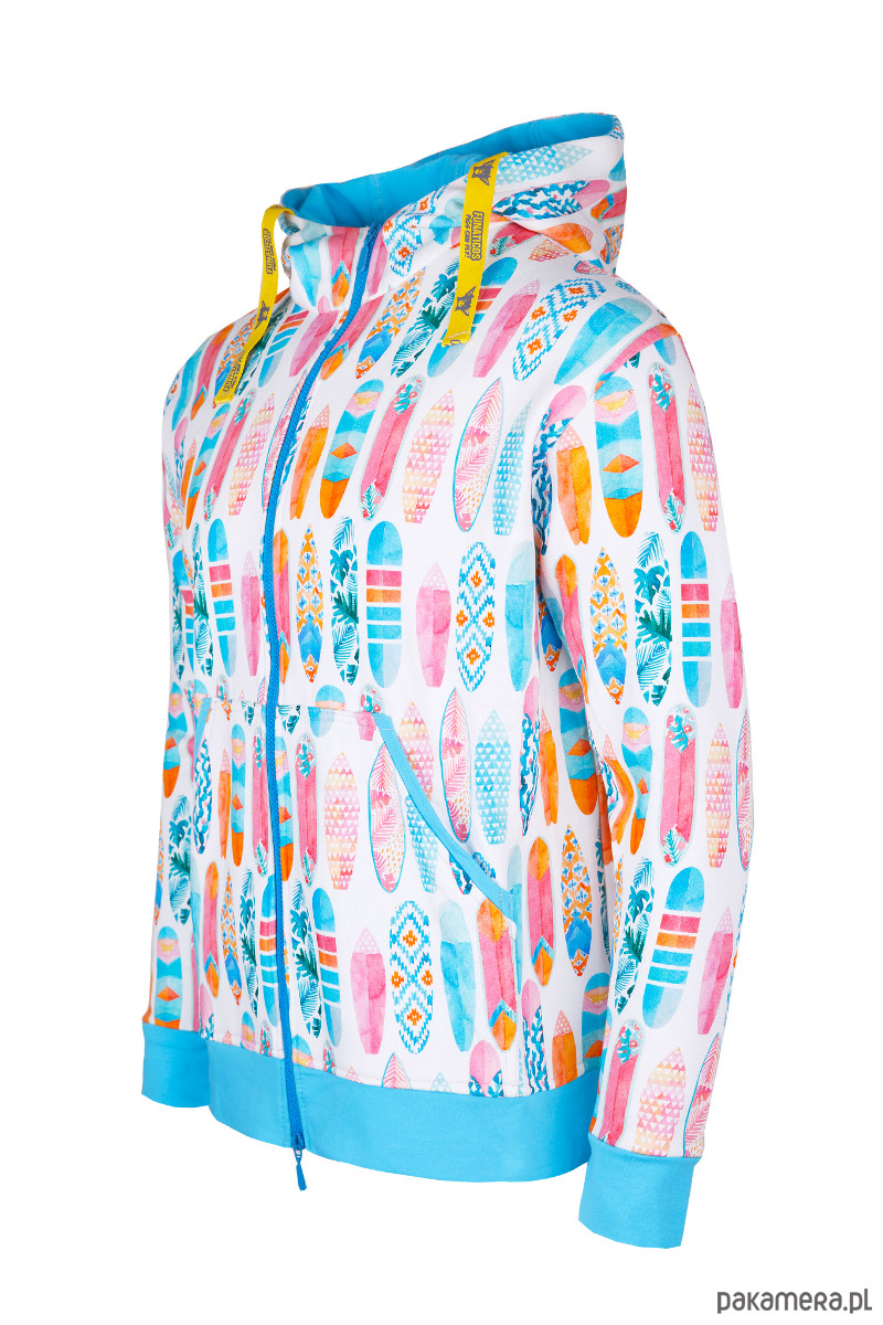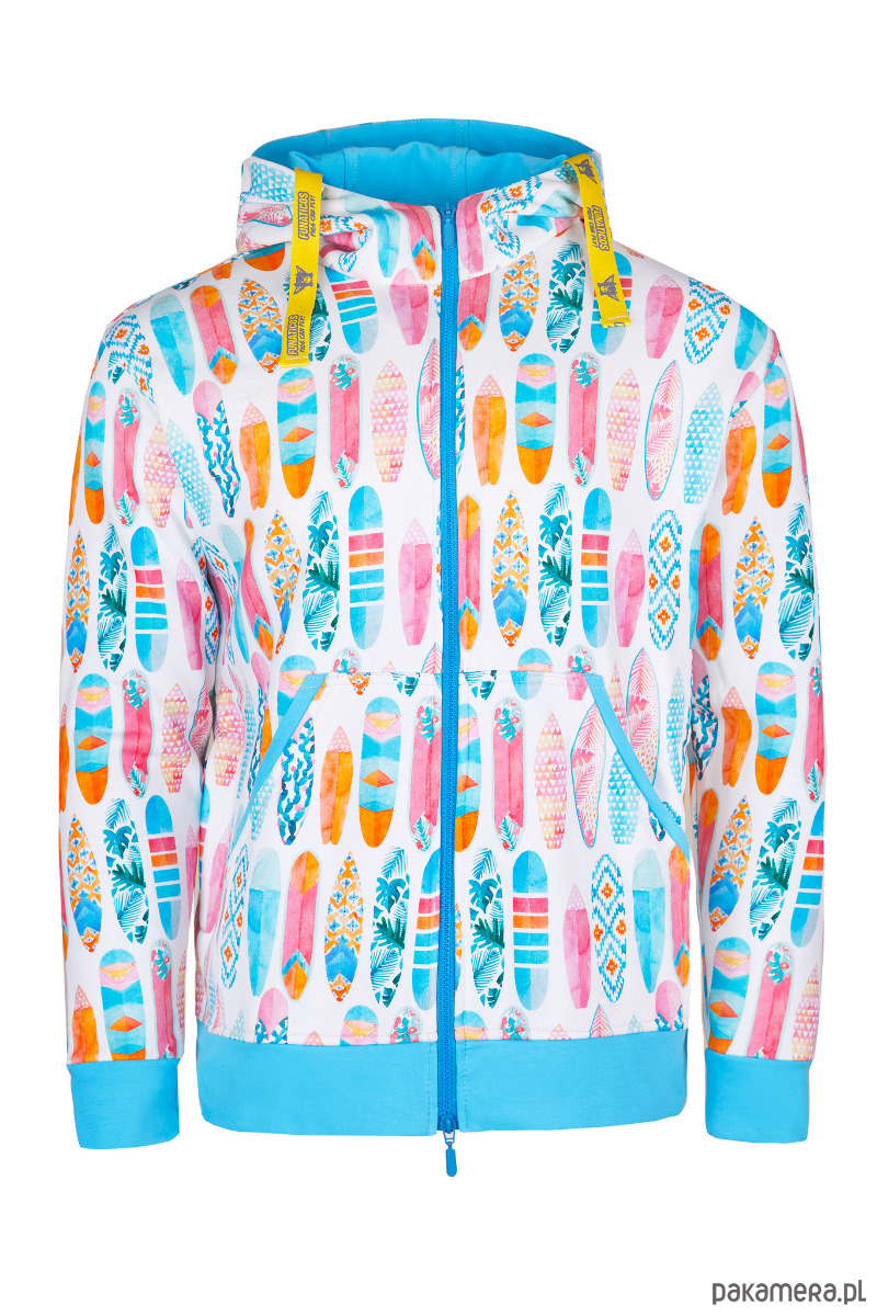 Rozpinana, ciepła bluza w surferskich klimatach. Wykona z drukowanej cyfrowo dzianiny drapanej (97% bawełna / 3% elastanu) o gramaturze 320 g/m2.