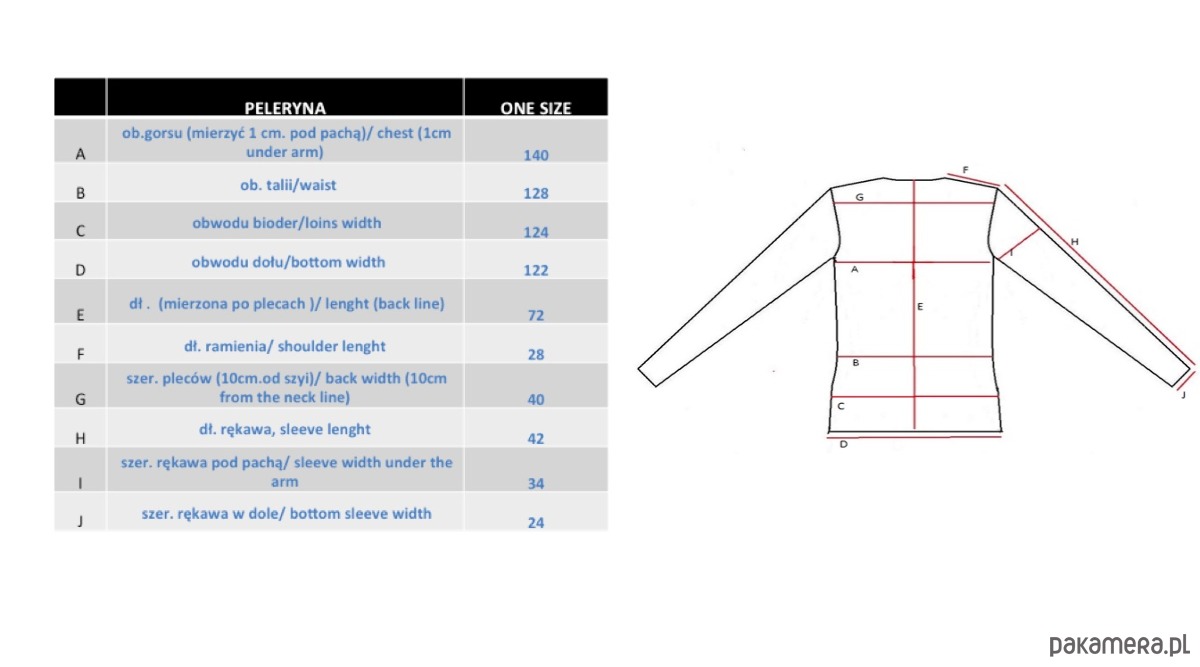 Peleryny dostępne w ONE SIZE, nie mają zapięcia.