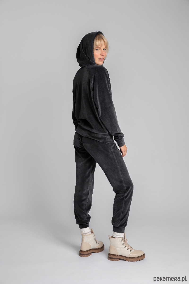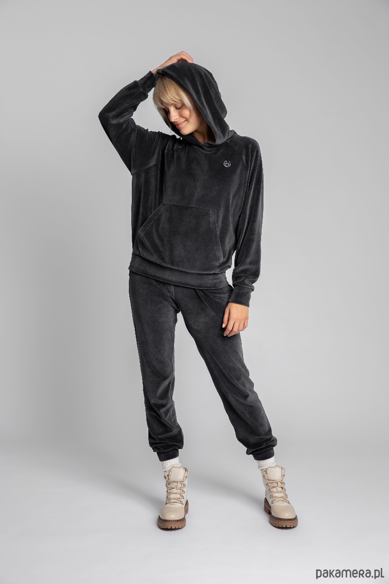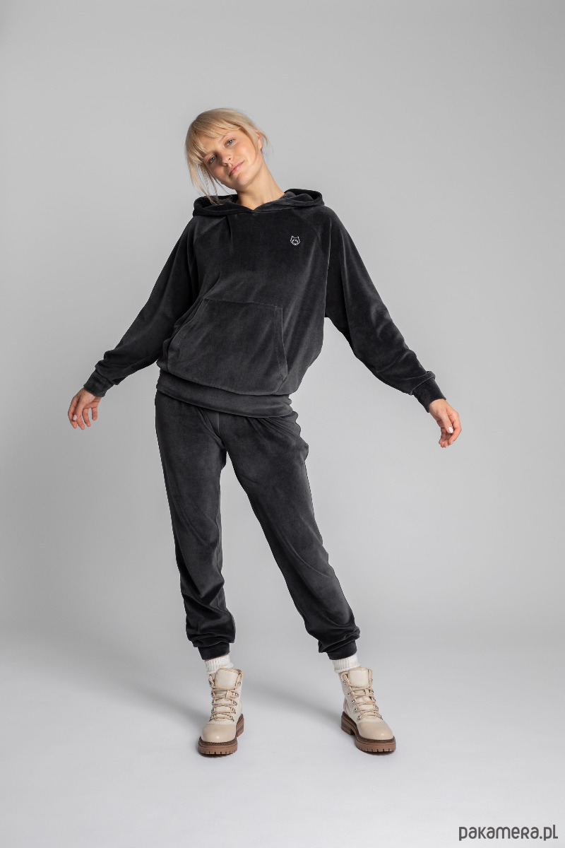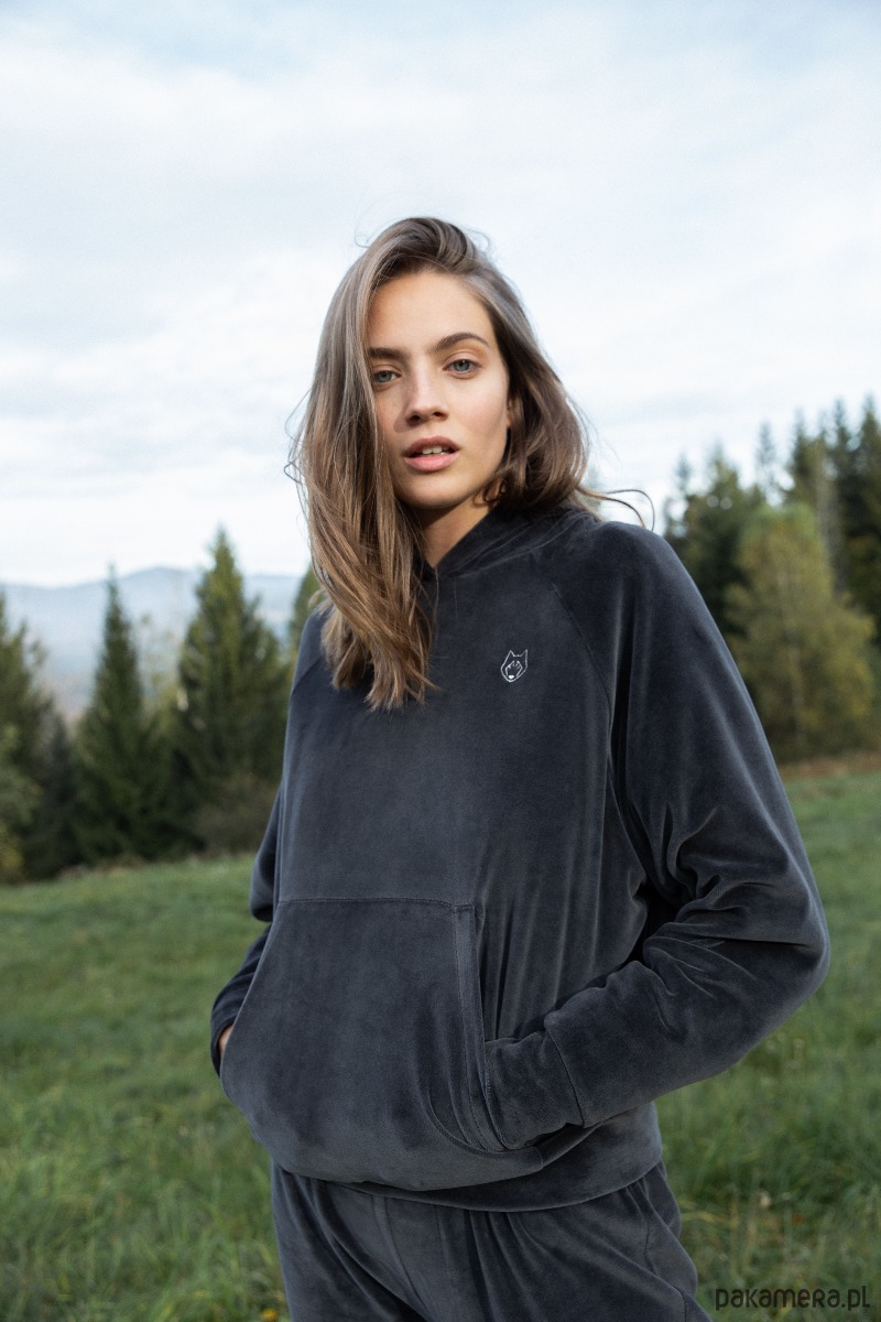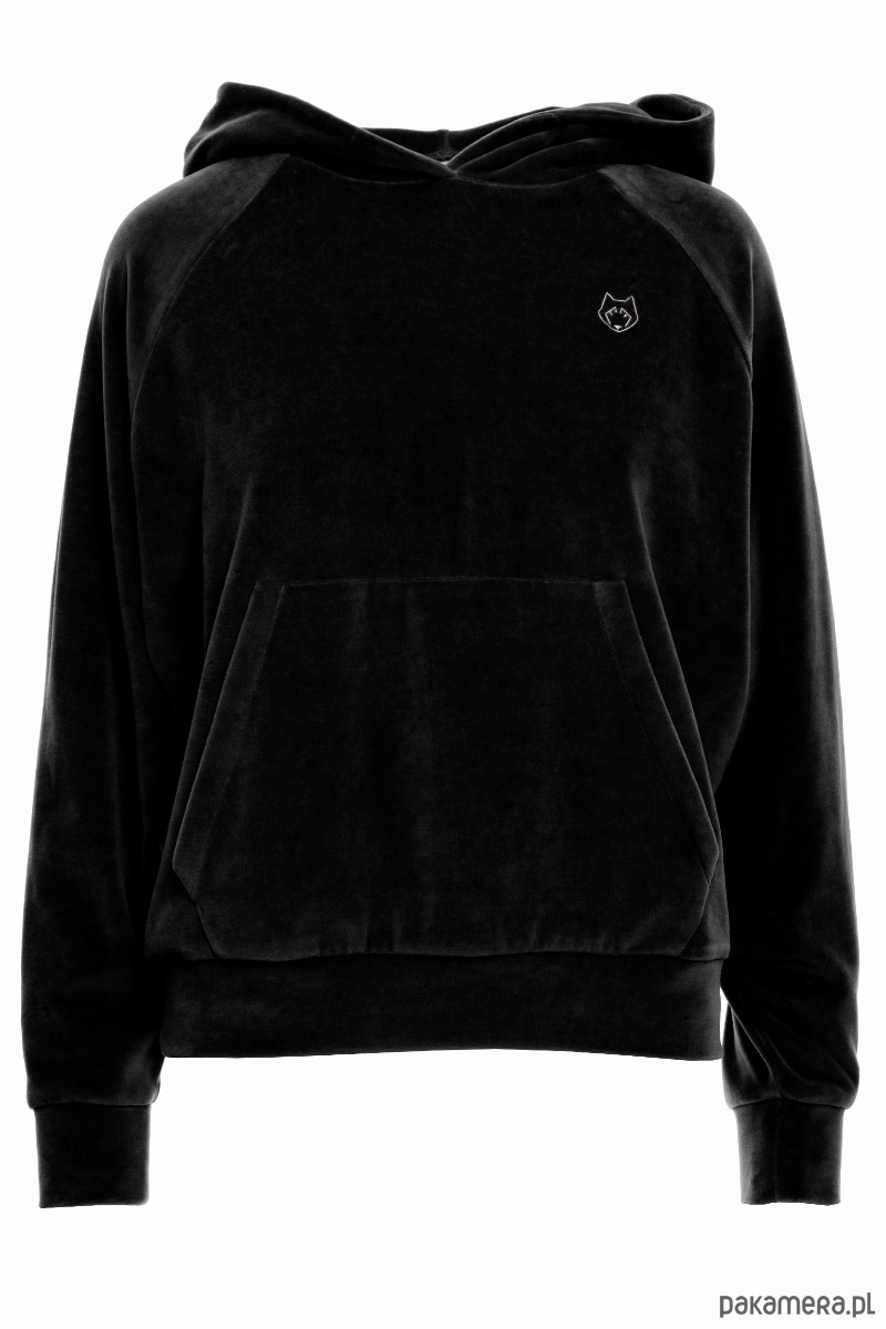 Welurowa bluza oversize - z poszerzonymi rękawami nietoperzowymi zakończonymi mankietami, kieszenią kangurek i kapturem oraz z ozdobnym wilczym haftem na piersi. To absolutny must-have do noszenia w domowym zaciszu jak i gdy potrzebujesz czegoś ciepłego na jesienną wycieczkę.