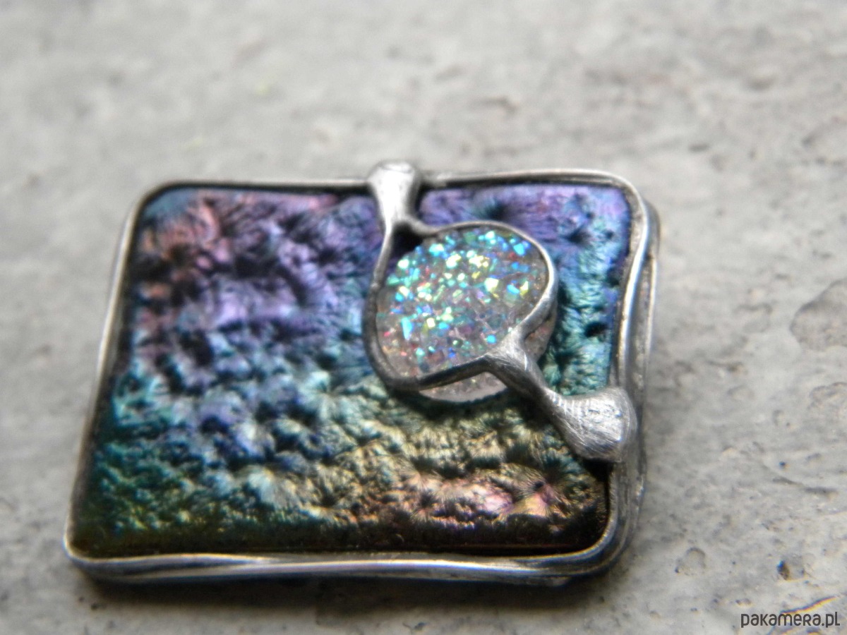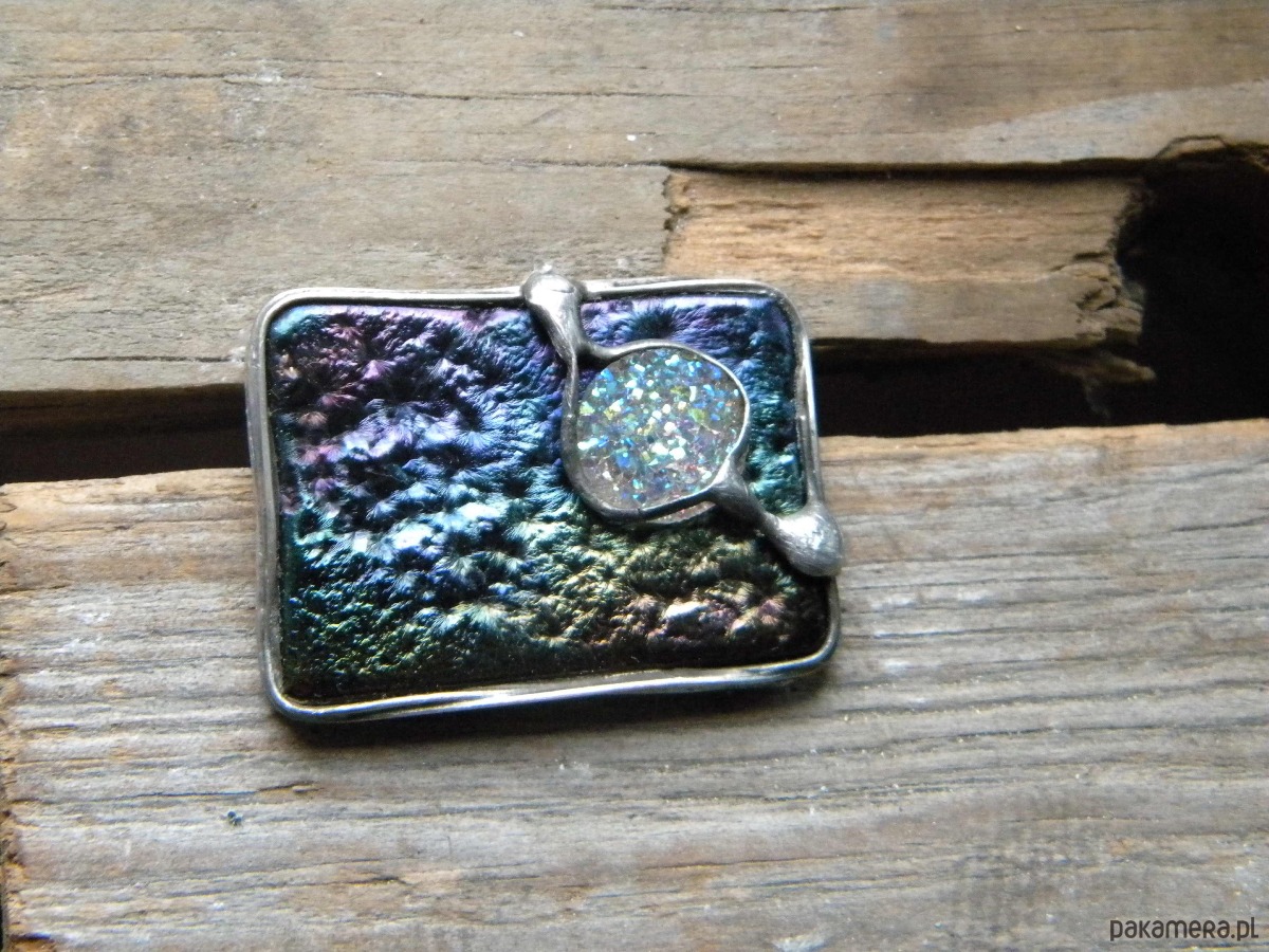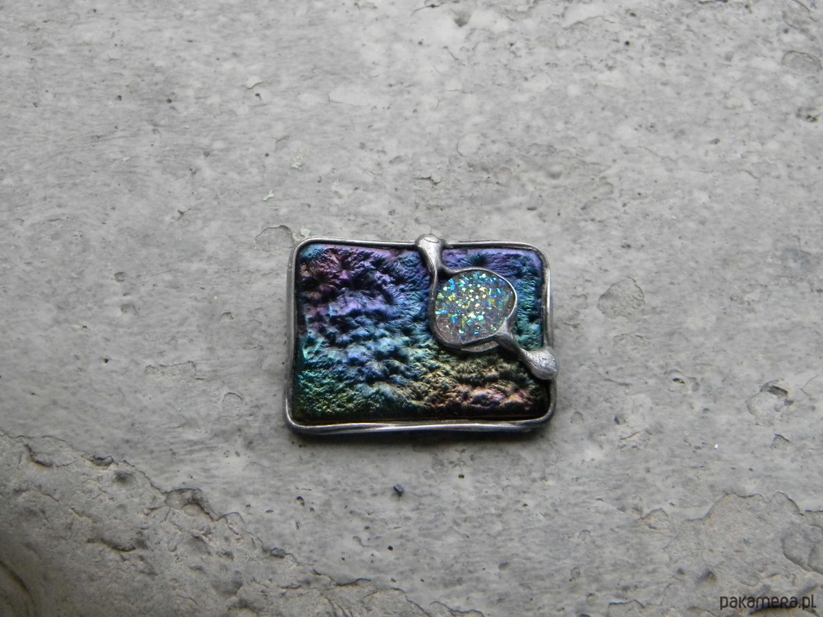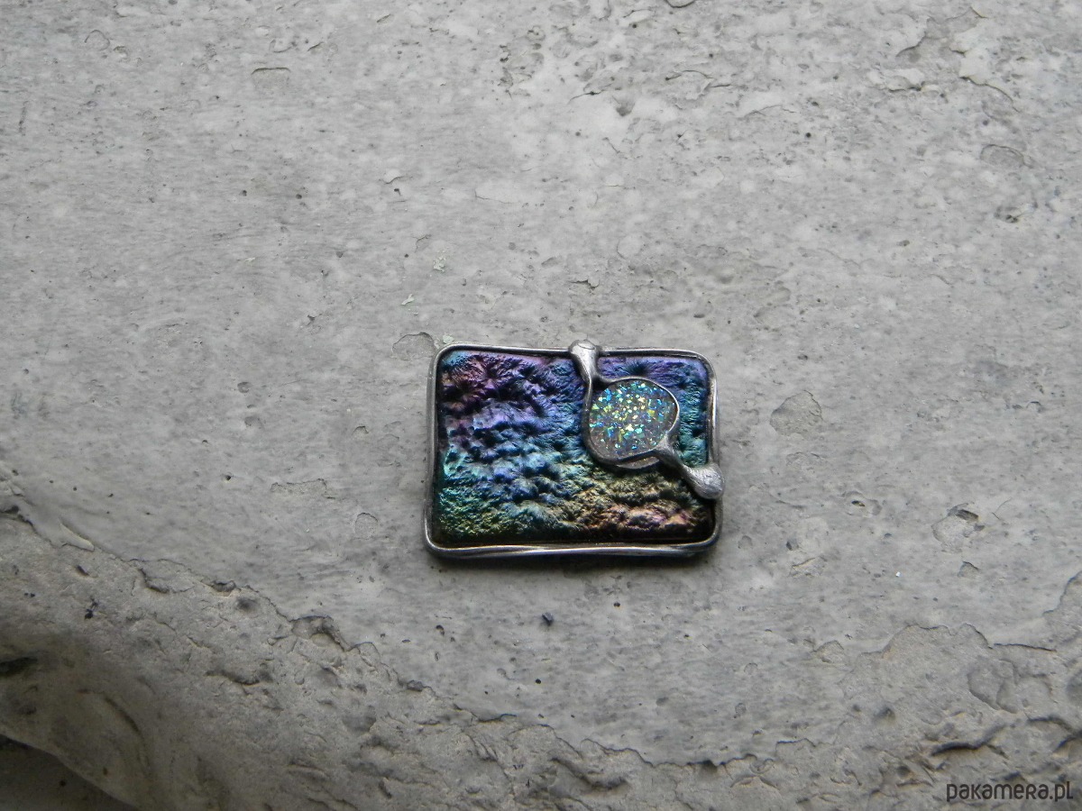 Broszka z kolekcji " powłoki - szkła eksperymetalne " Uzyskane efekty są techniką własną. powierzchnia szkła pokryta jest nieścieralną powłoką , wtopioną w szkło bazowe.