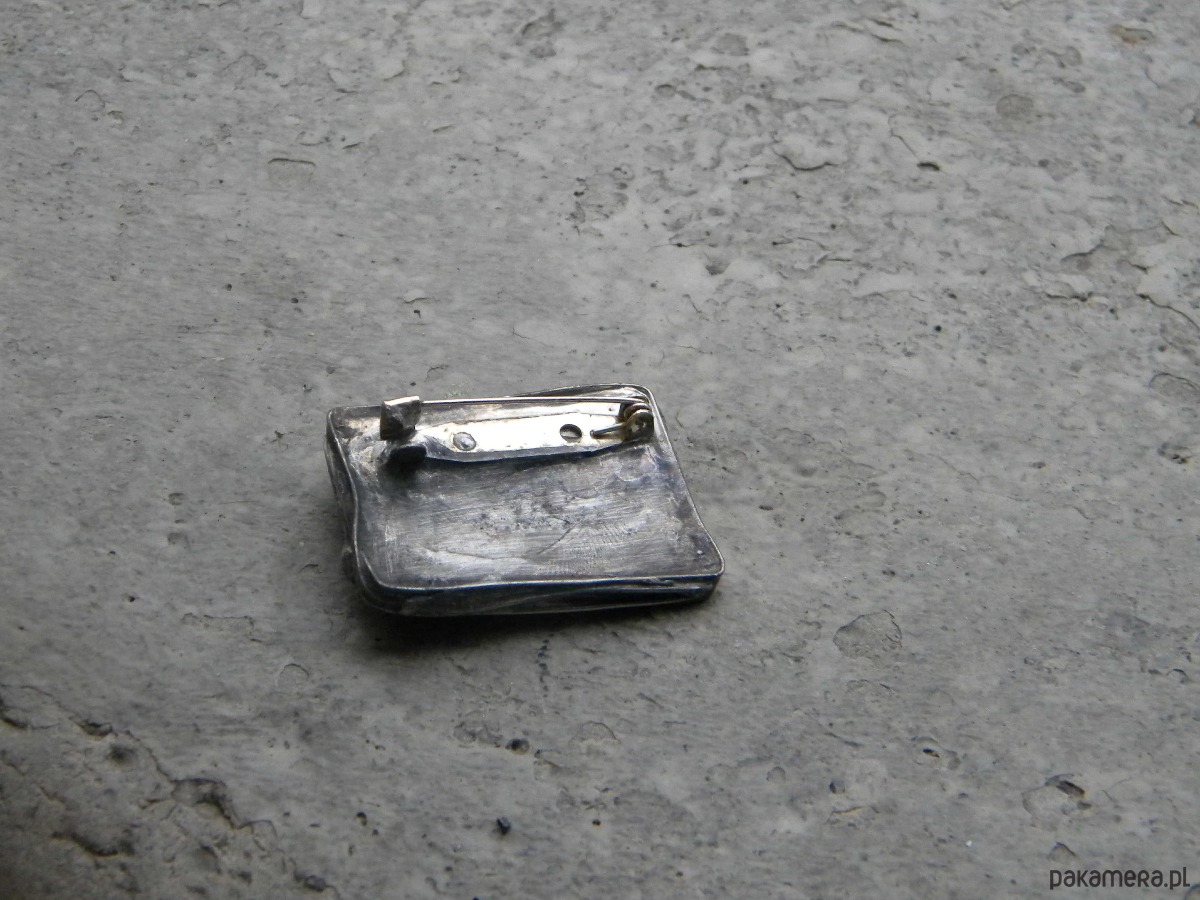 broszka ze szkła i żywicy w oprawie z ocynowanej miedzi