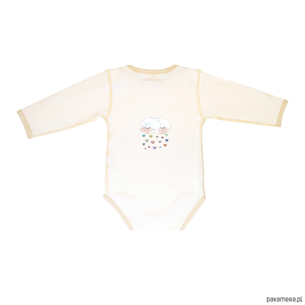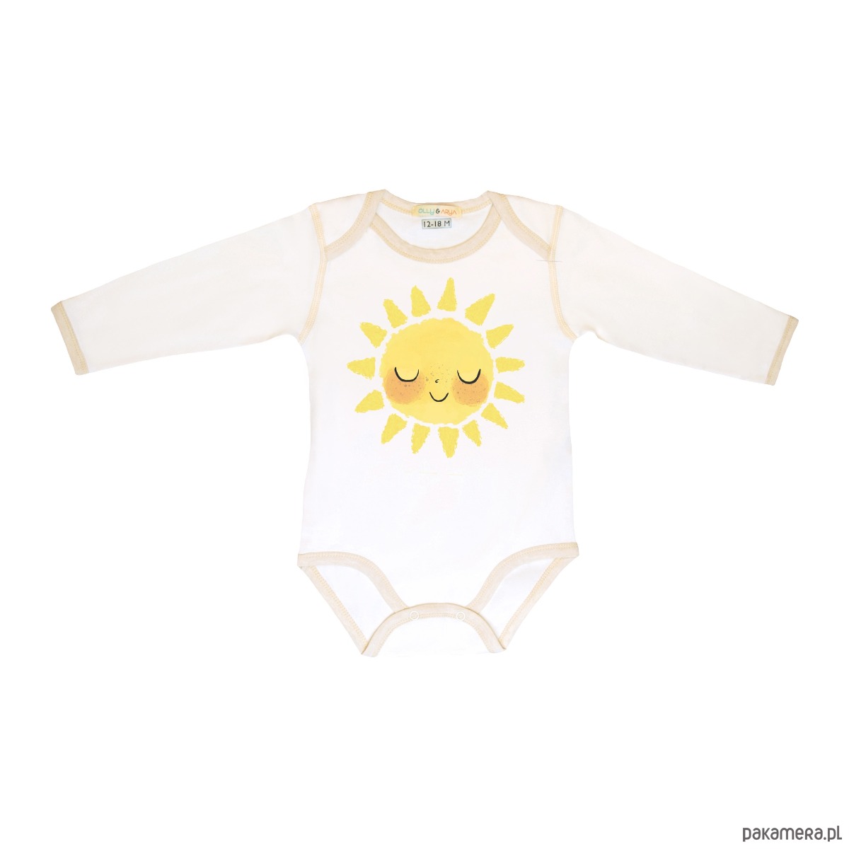 Body są z długim rękawem, w kolorze bieli z beżowym wykończeniem. Body są wykonane w 100% z organicznej bawełny z naszą ilustracją słońca, i mała chmurka z tyłu.