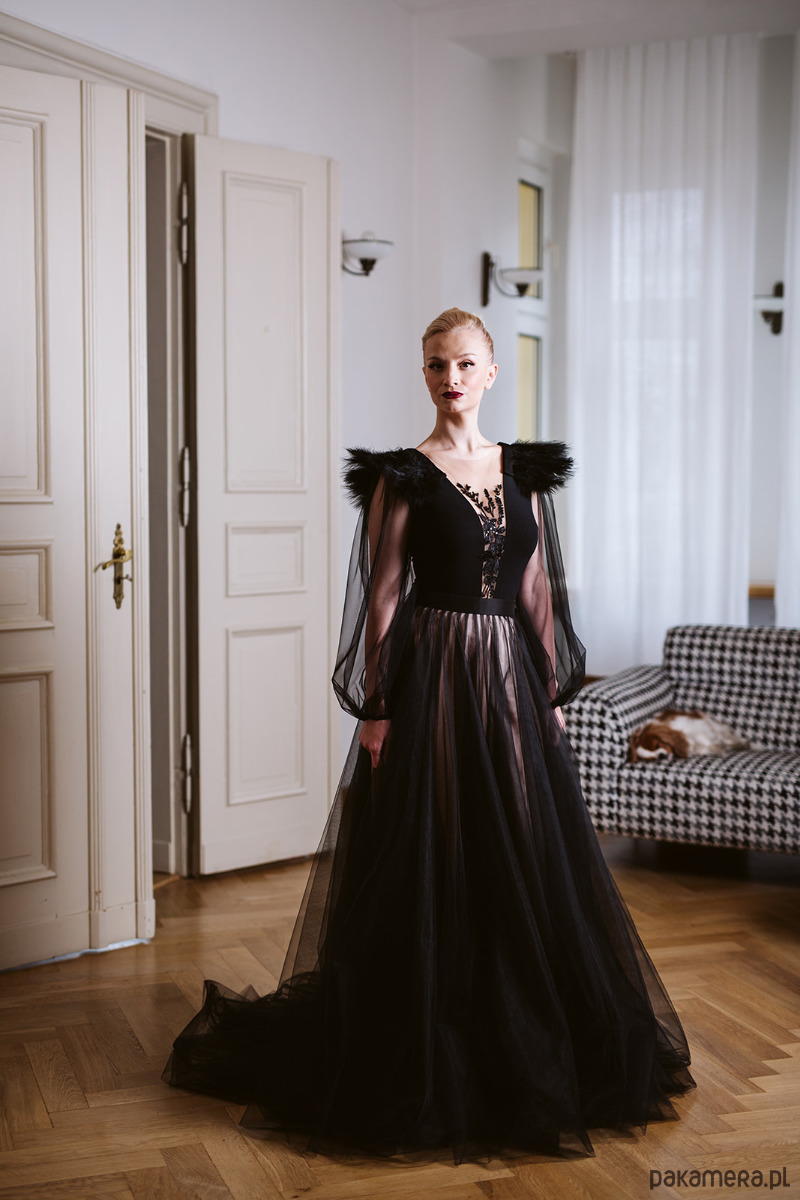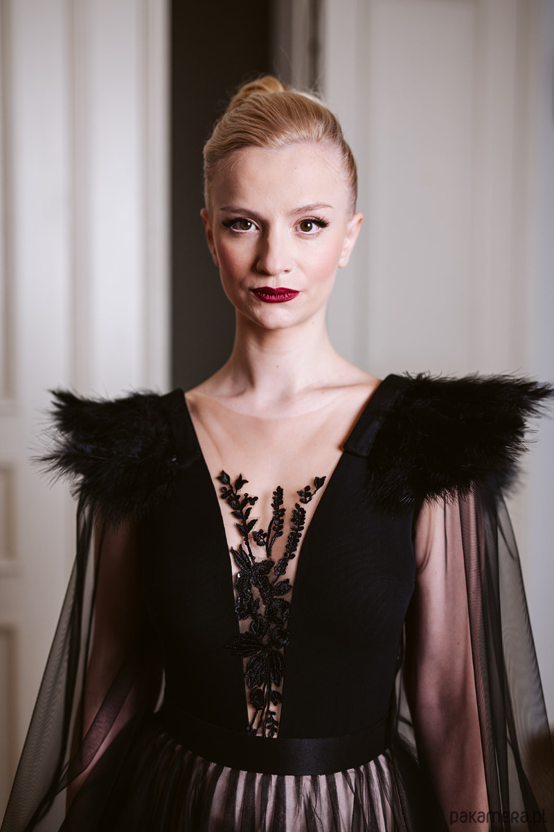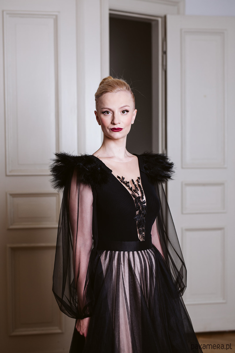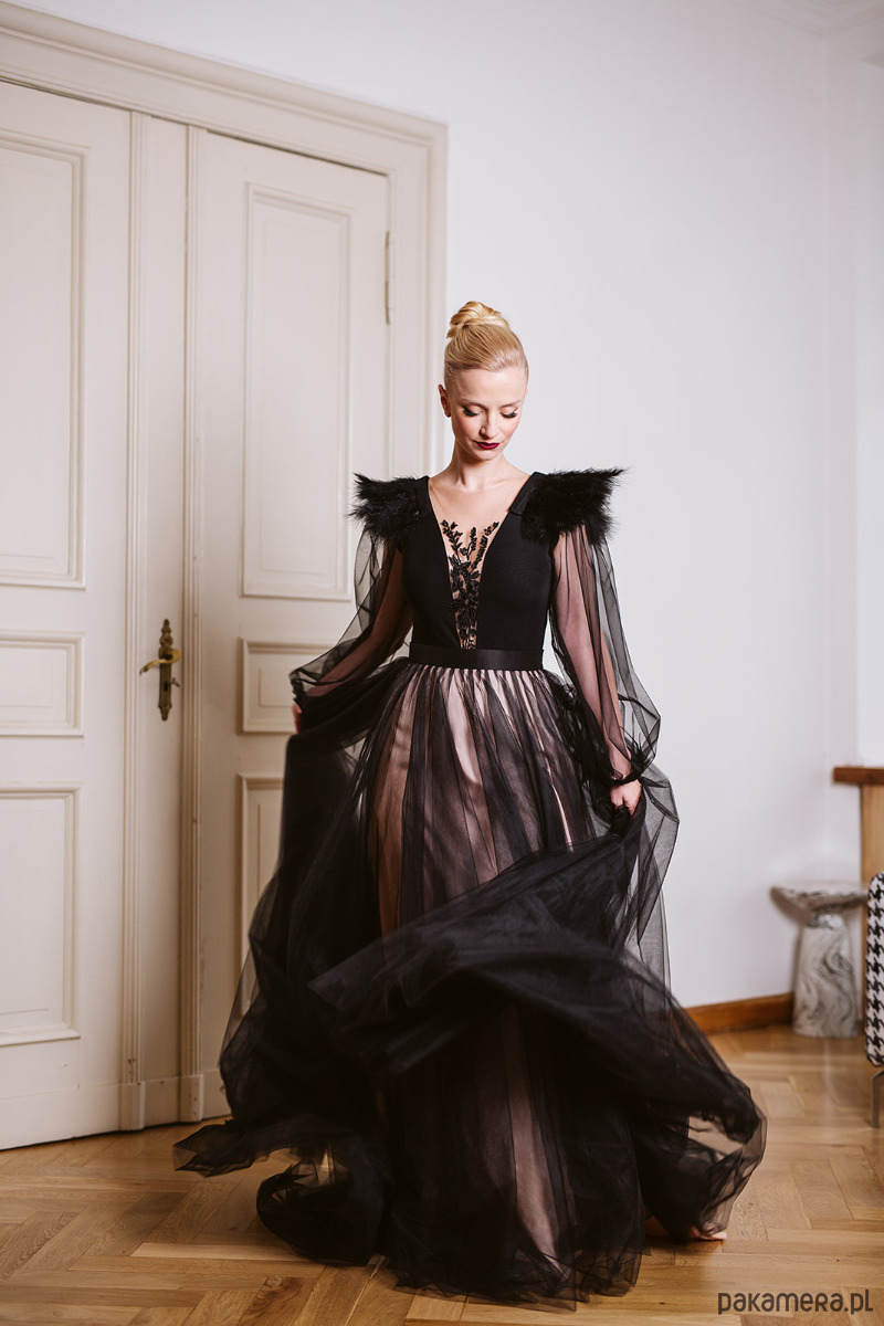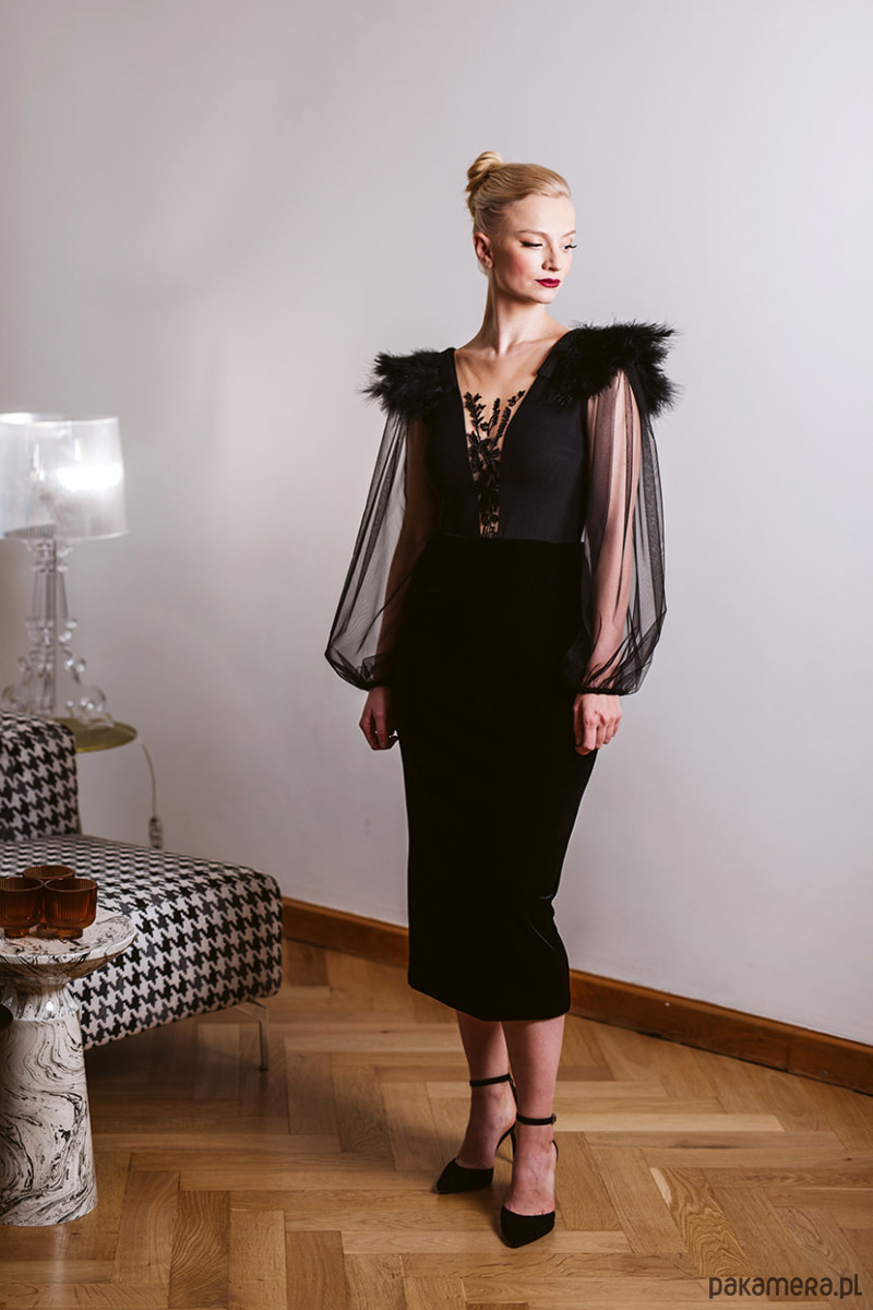 Niezwykle efektowne i eleganckie body uszyte z elastycznej siatki oraz dżerseju. Bufiaste rękawy oraz pióra tworzą absolutny efekt WOW. Delikatny dekolt optycznie wydłuża sylwetkę. Elementy koronki, które naszywane są każdy z osobna, pozwala na swobodne założenie biustonosza.