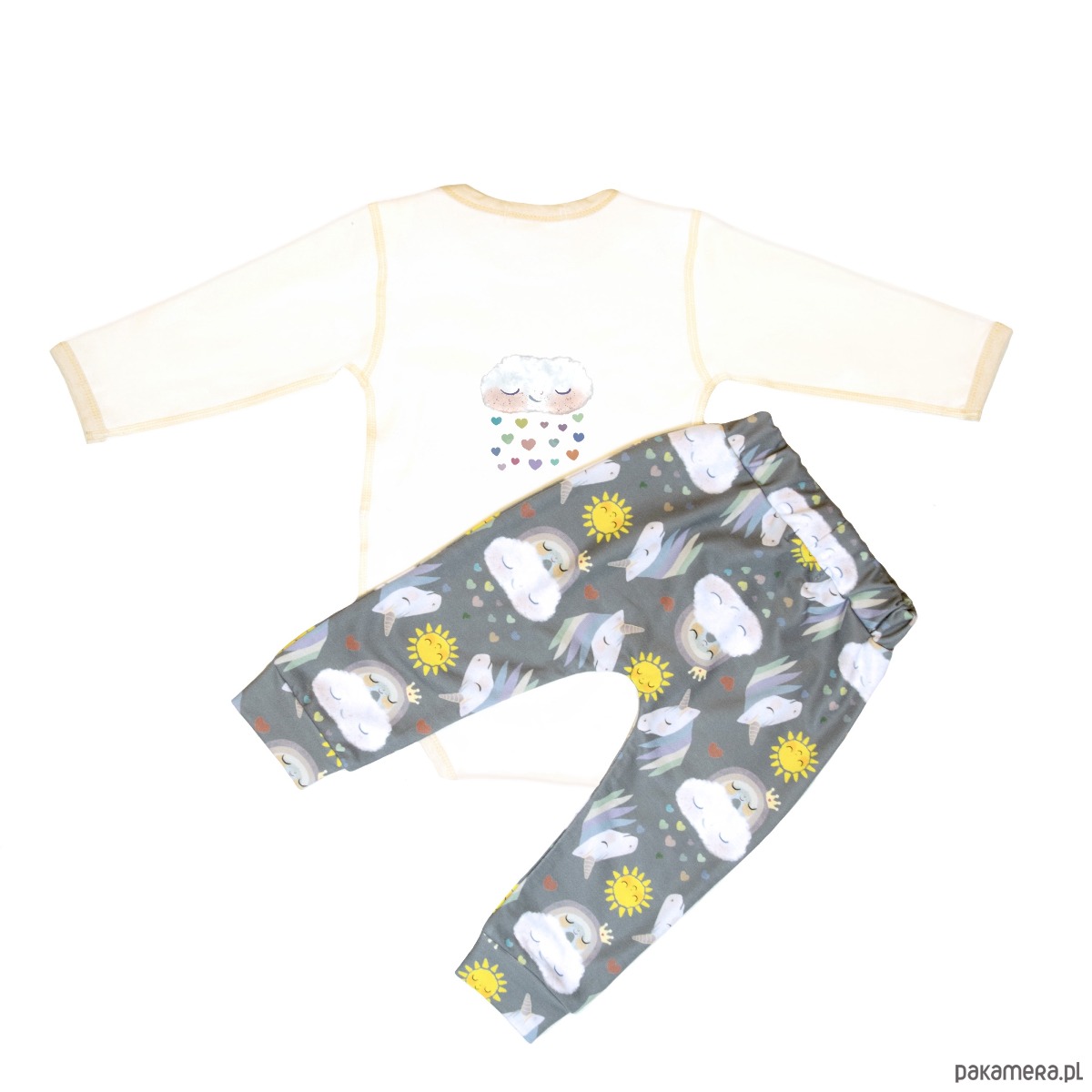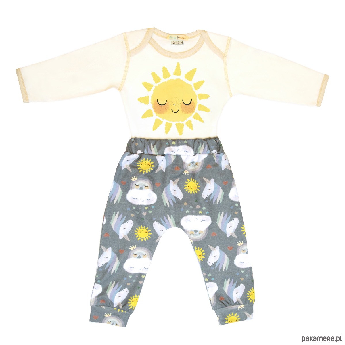 Body są wykonane w 100% z organicznej bawełny, w kolorze bieli z beżowym wykończeniem. Przód ma druk słońca, tył ma chmurkę.