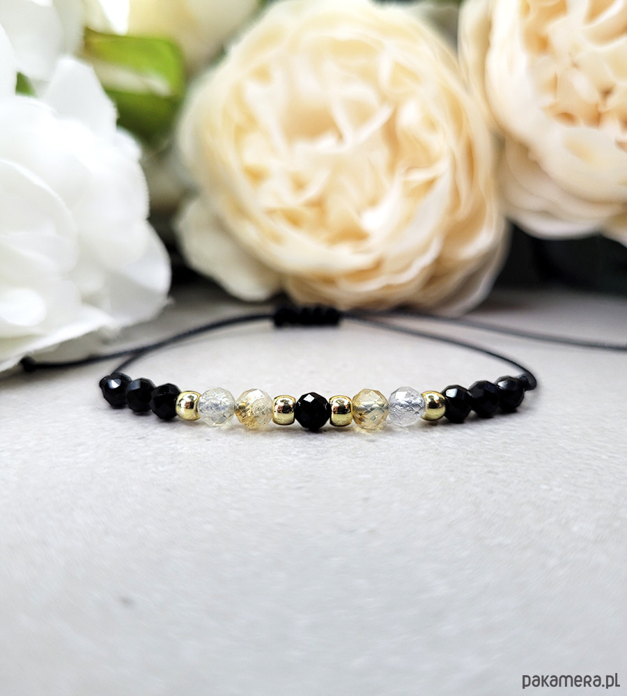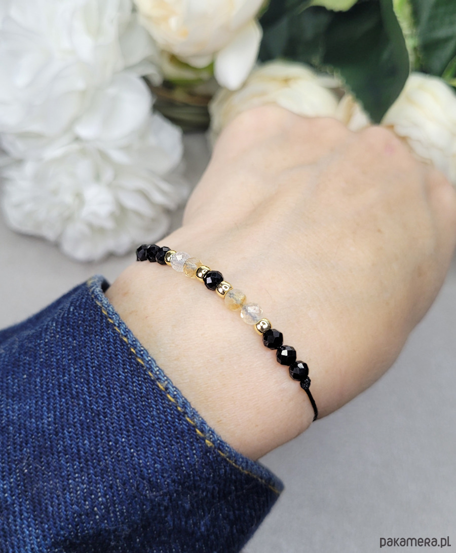 Przepiękna delikatna bransoletka zrobiona z kamieni naturalnych: Turmalinu, Cytrynu, Spinelu i Hematytu w kolorze złota.